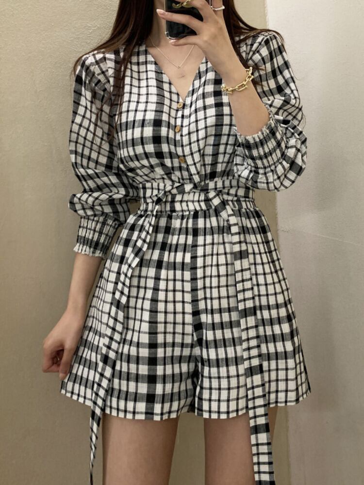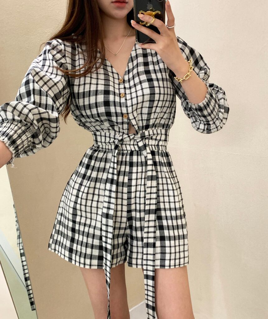 [EWQ] V ネック チェック柄シングル ブレスト シャツ + ハイ ウエスト ルーズ ショーツ ツーピース スーツ サマー コントラスト セット 7468 ハイウェスト 夏物 ブルマー Vネック