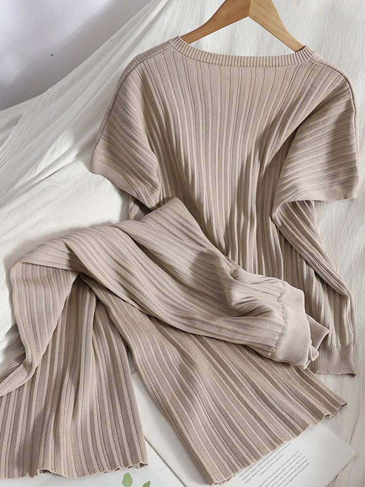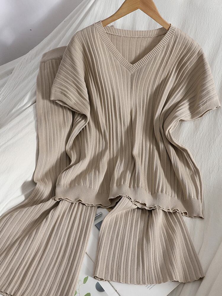 [EWQ] ニットスーツ夏潮無地 V ネック半袖ニットトップ + ワイドレッグパンツプリーツニットセット ショート ハーフスリーブ サマー 夏物 Vネック ワイドパンツ ソリッドカラー
