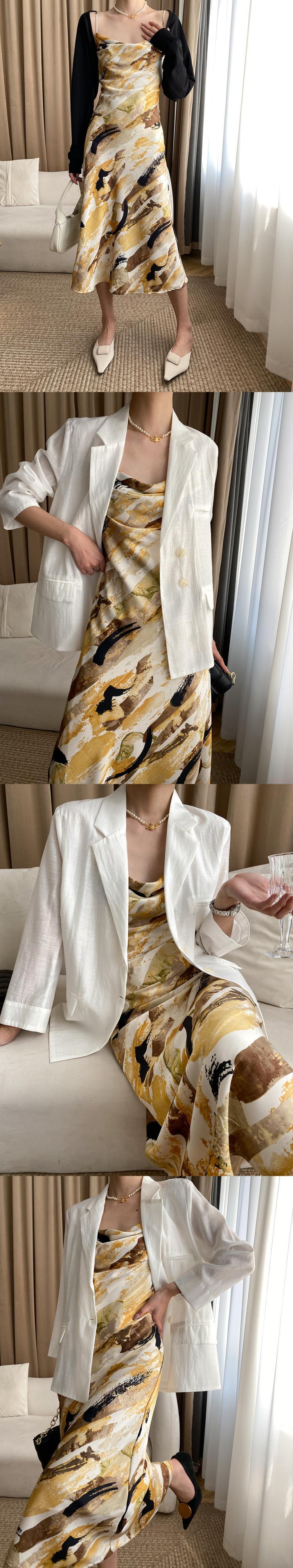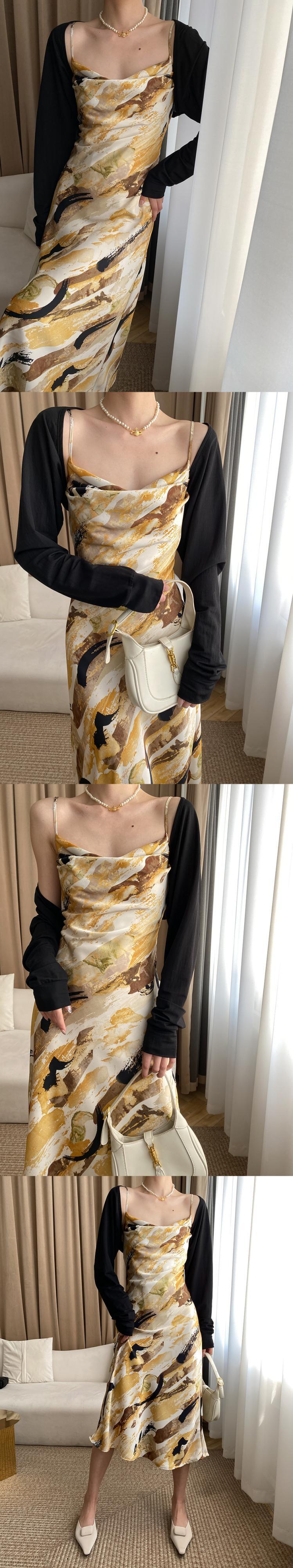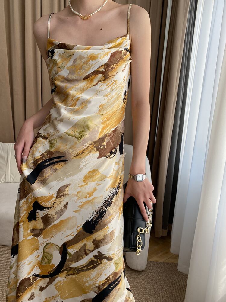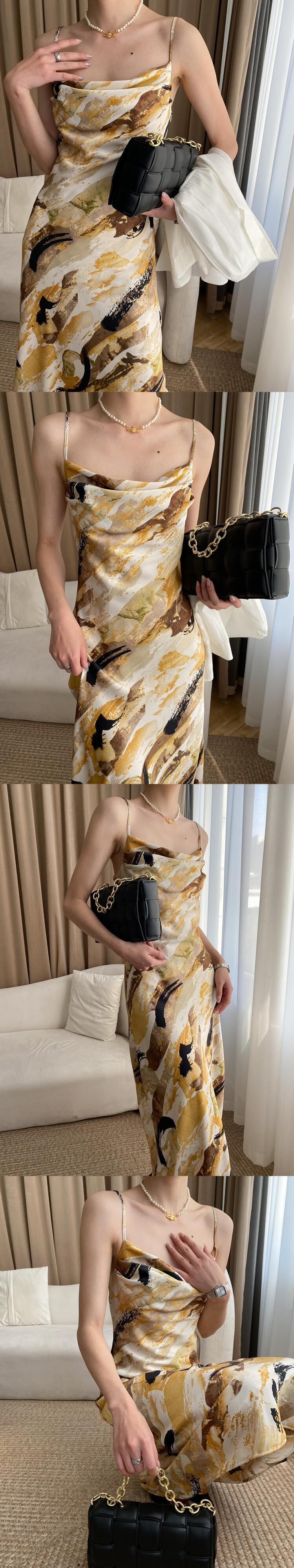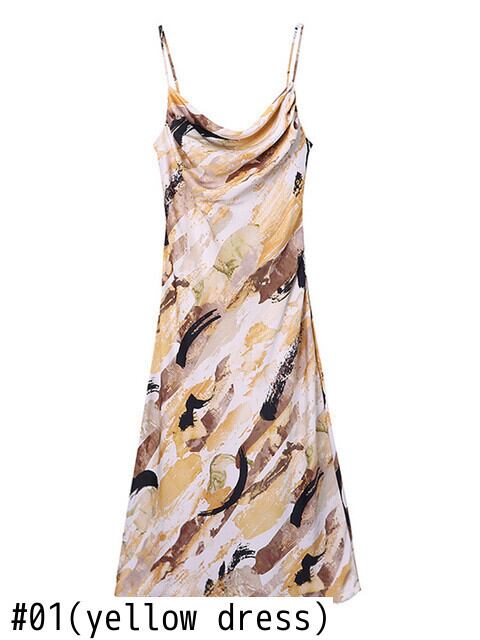 [EWQ] レディース プリント スリング ドレス コントラスト カラー シフォン ノースリーブ ロング ドレス サマー タイド オフショルダー Vestido 夏物