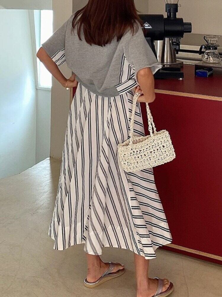 [EWQ] パッチワーク フェイク ツーピース ストライプ ドレスフライング スリーブ ドレス夏潮 Vestido 16Y8751 サマー 夏物