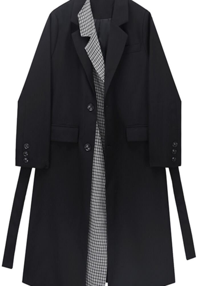 【EWQ】トレンチコート アウター 長袖 パッチワーク ビッグサイズ ブラック ホワイト チェック シングルブレスト 気質 ウインドブレーカー 春 ロング スプリング 春物
