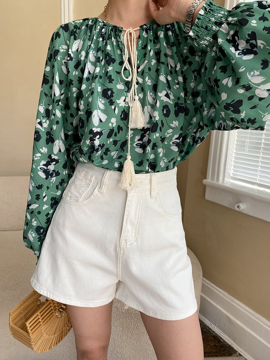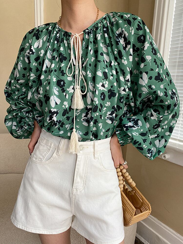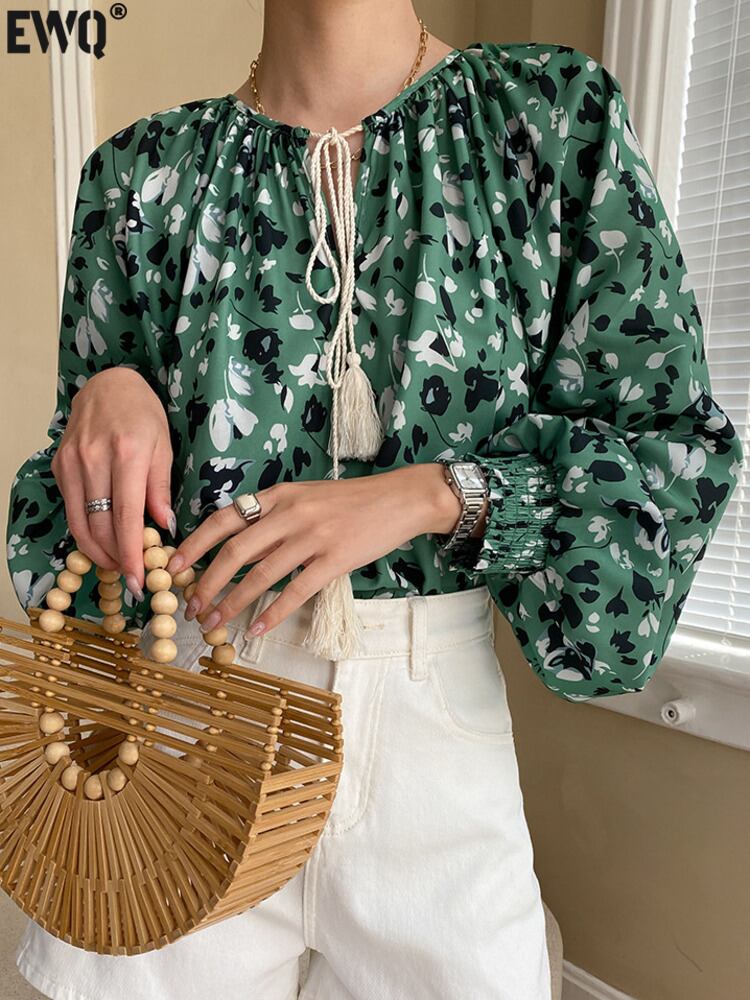 【EWQ】花柄プリント レースアップ ゆったり ランタンスリーブ ブラウス レジャー おでかけ ベーシック 上着 春潮 スプリング 春物