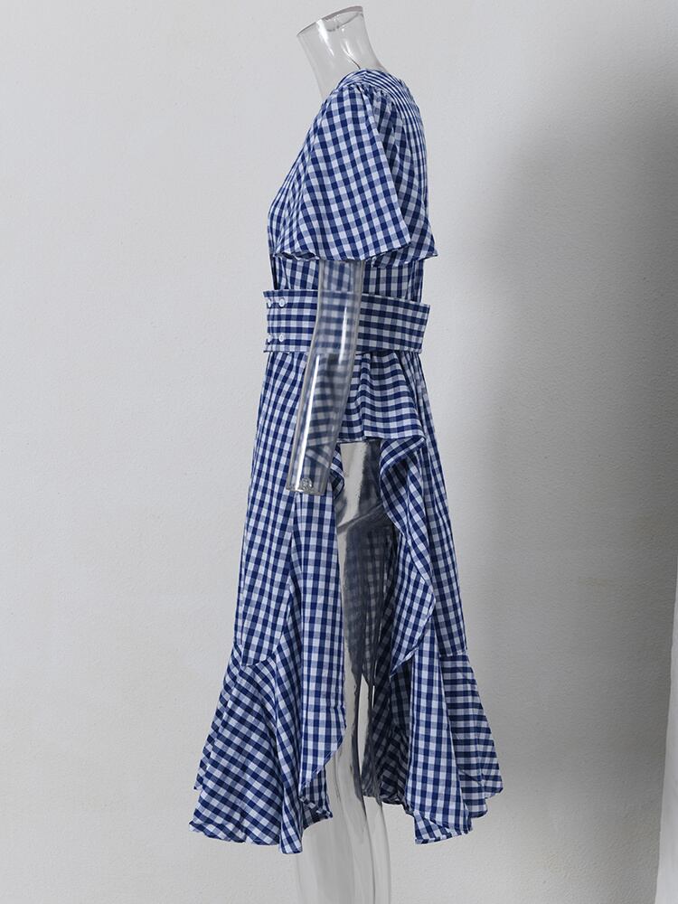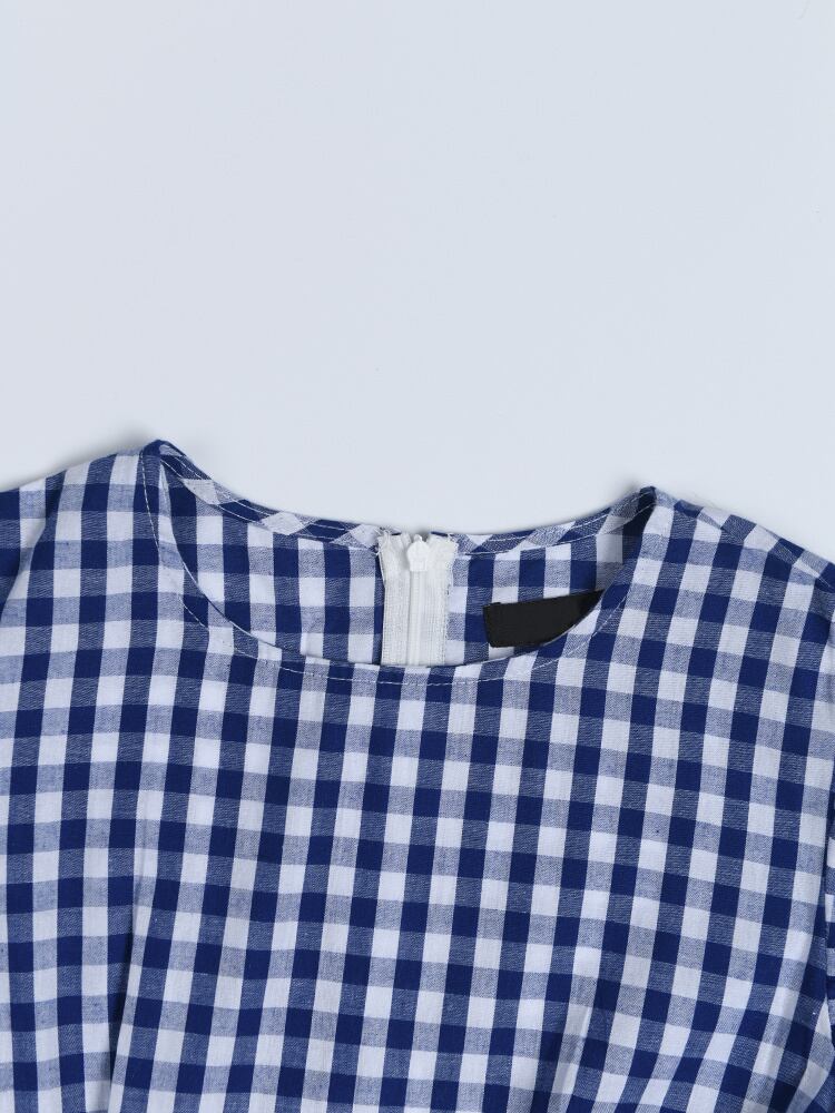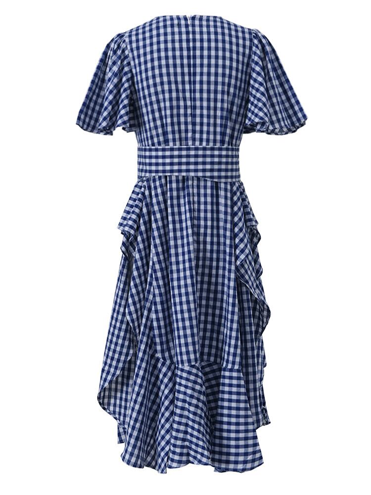 [EWQ]レディースブルーチェックベントバンデージホリデードレスOネック半袖ルーズフィット春夏ロングローブロス ショート ハーフスリーブ スプリング 春物 サマー 夏物