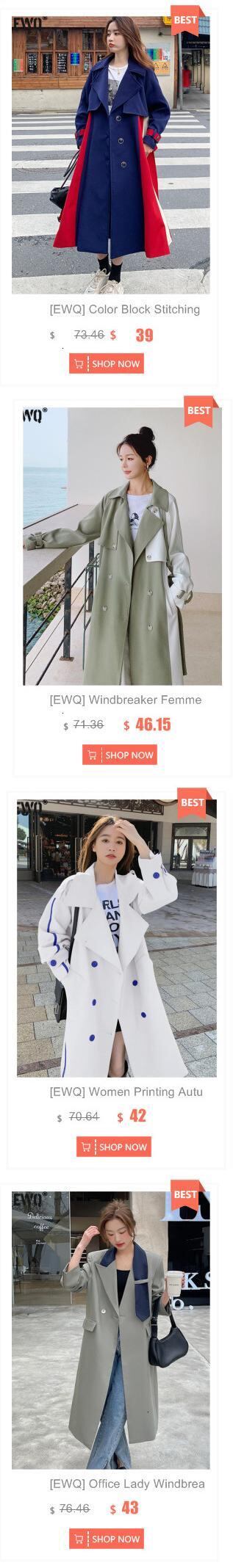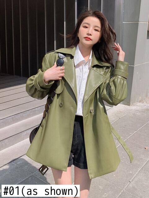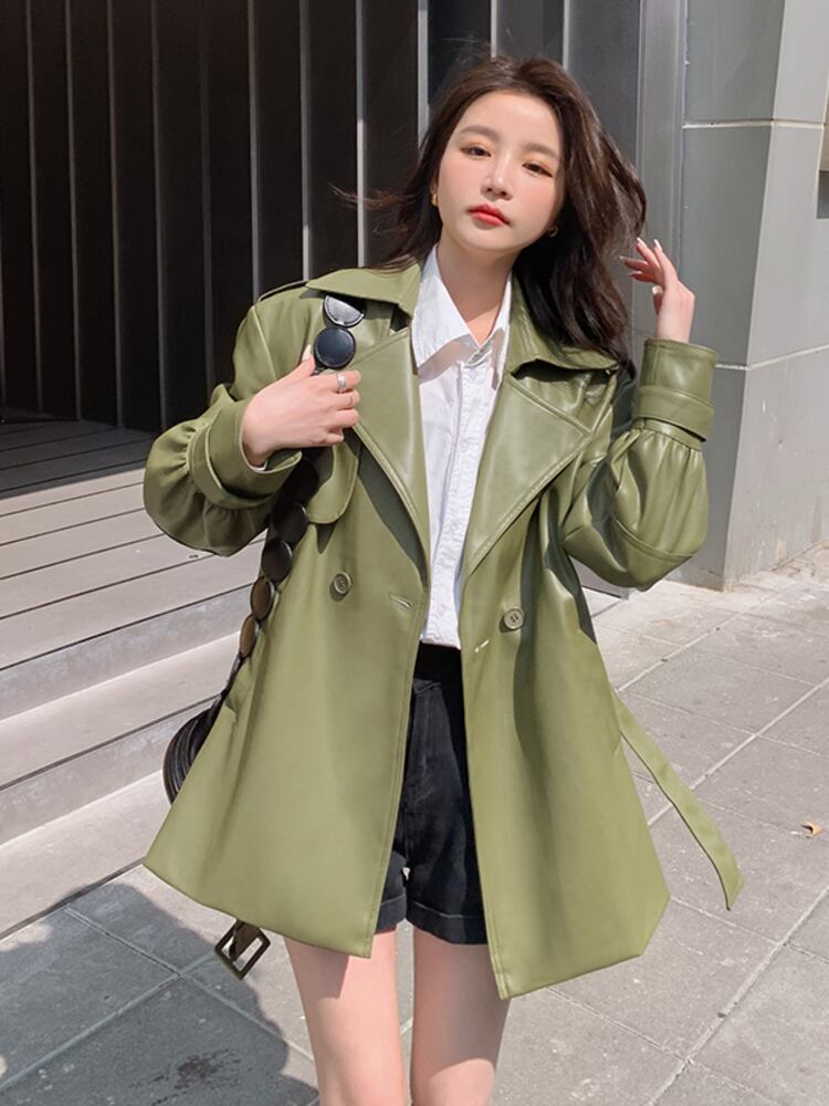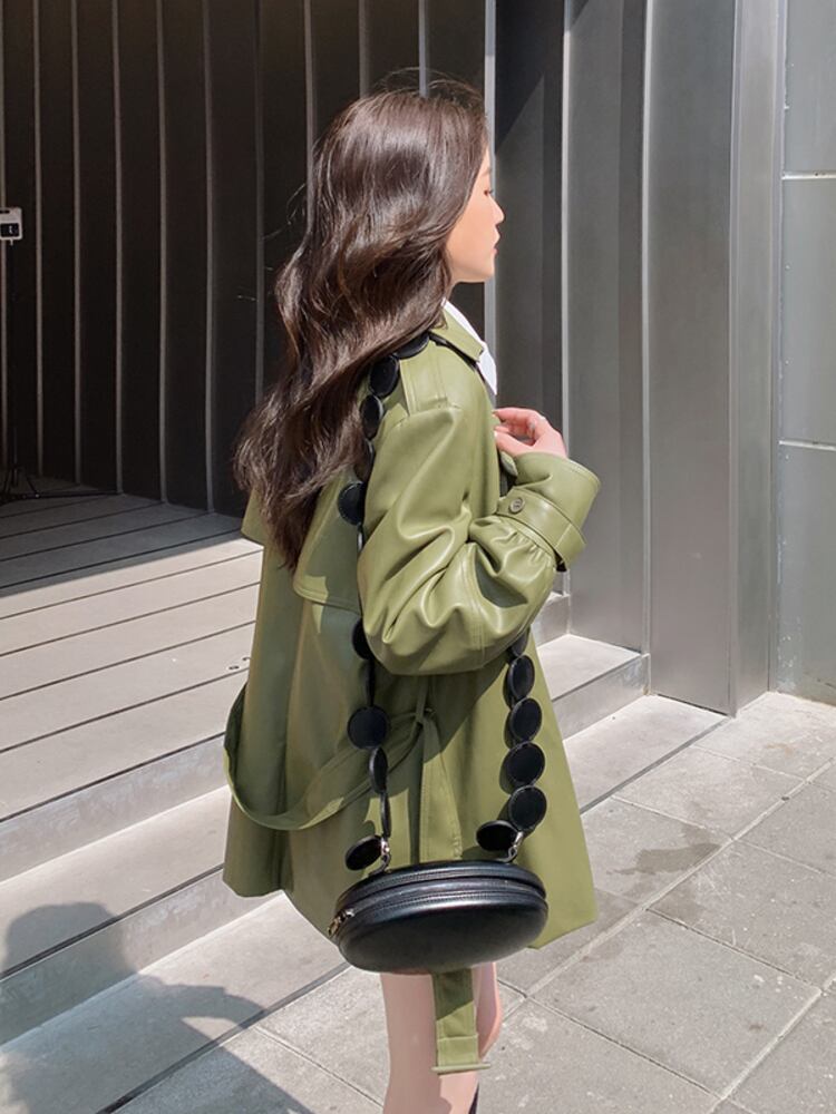 【EWQ】ターンダウンカラー長袖レディースPUコートダブルブレストシンプルアーミーグリーントレンドレザージャケット ロング