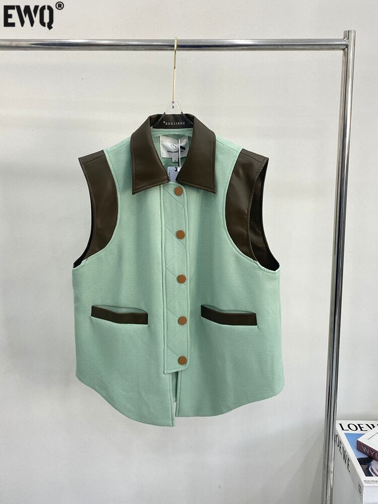 [EWQ] コントラスト カラー シングル ブレスト ベストラプル PU パッチワーク ノースリーブ ジャケット夏ジッパー トップ 7749 サマー 夏物