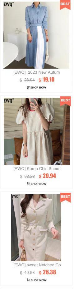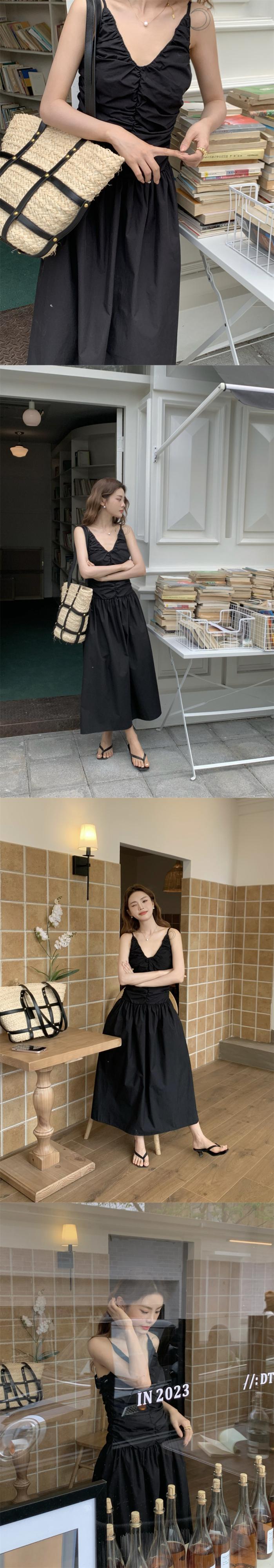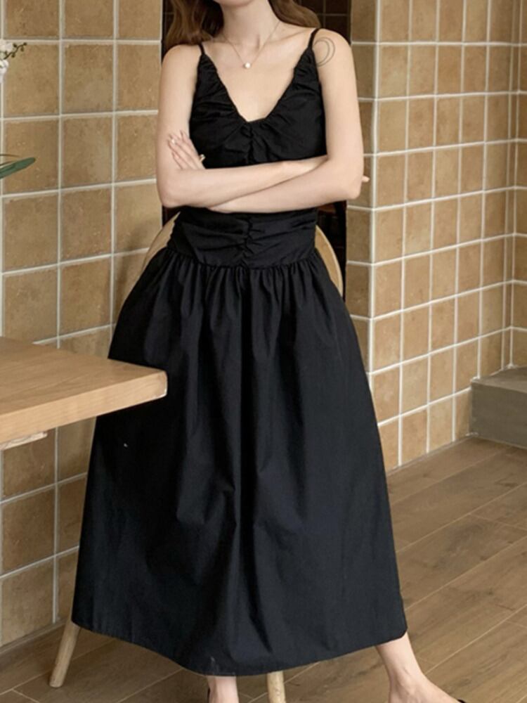 [EWQ] V ネック プリーツ ウエスト スリム スリング ドレス無地カジュアル ノースリーブ ミディ ドレス夏潮 Vestido サマー 夏物 Vネック ソリッドカラー