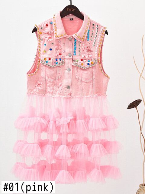 [EWQ] 中空美しいデニム ベスト スプライス メッシュ シングル ブレスト ノースリーブ リベット ジャケット夏潮アウター サマー 夏物