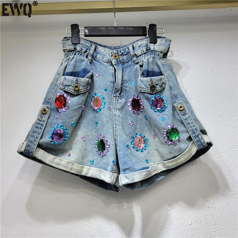 [EWQ] カラフルダイヤモンド デニム ショーツ ストリート ウエスト ルーズ A ライン ワイドレッグ ショート ジーンズ夏潮服 サマー 夏物 ブルマー Aライン ワイドパンツ