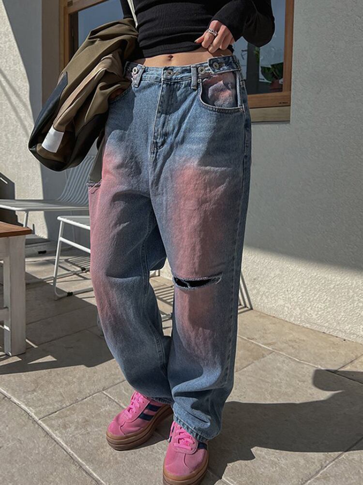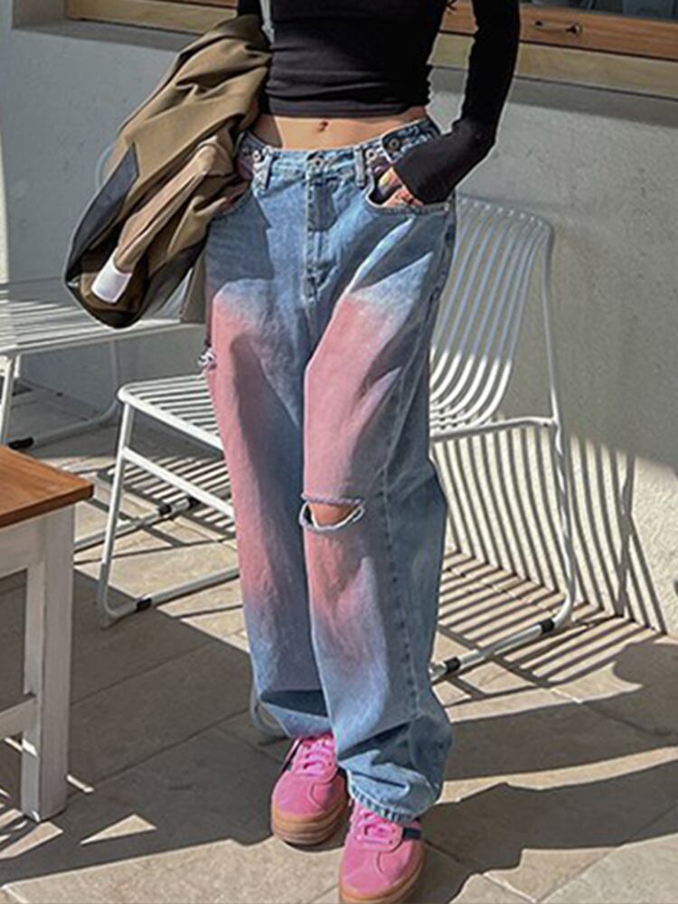 [EWQ] グラデーション ホール デニム パンツ春夏潮ストリート ウエスト ポケット ジーンズ タイダイ ズボン スプリング 春物 サマー 夏物