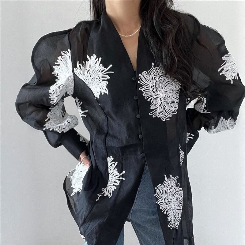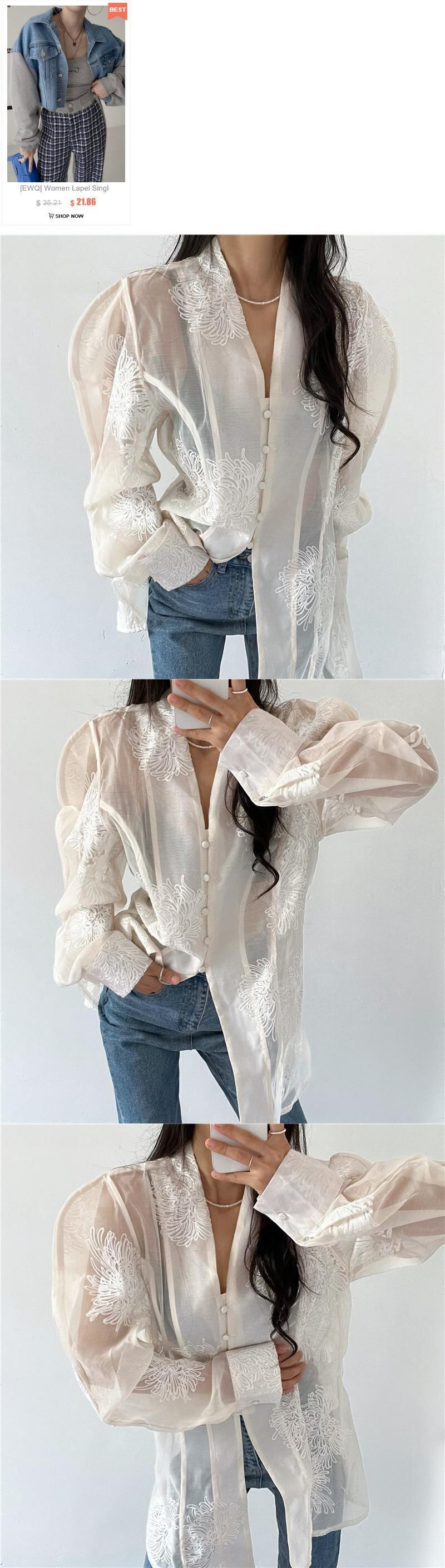 [EWQ] シックシャツ V ネック刺繍フック花ルース ブラウス トップ春潮長袖トップス ロング スプリング 春物 Vネック フラワーデザイン