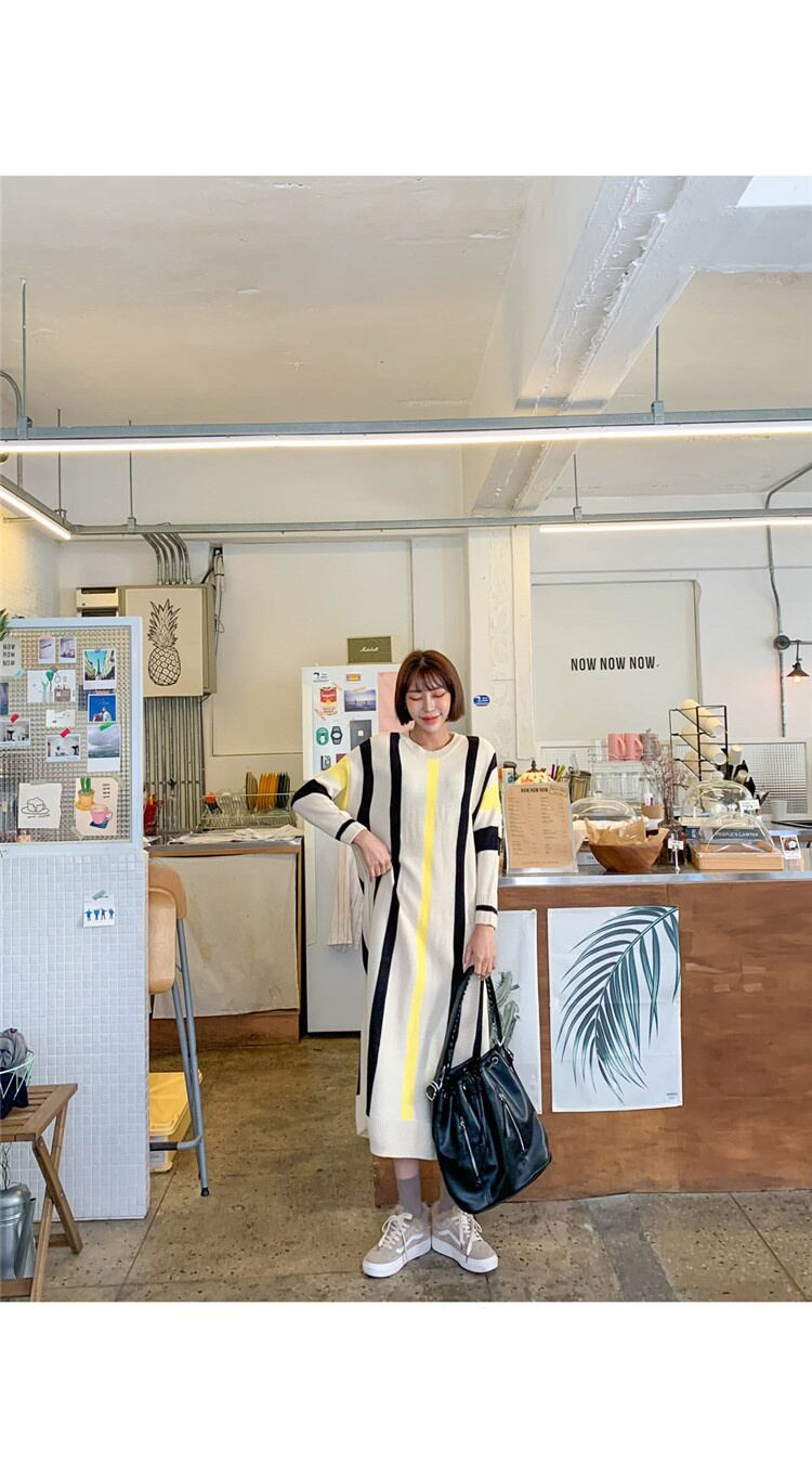 【EWQ】長袖 ストライプ ニット セーター ロング ストレート ビッグサイズ あったか レディース ワンピース トレンド 冬 16R3068 ウィンター 冬物