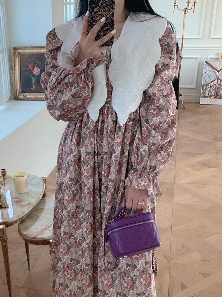 [EWQ] スタイル レース パッチワーク プリント A ライン ドレス長袖コントラスト マキシ ドレス夏 Vestido ロング サマー 夏物 Aライン