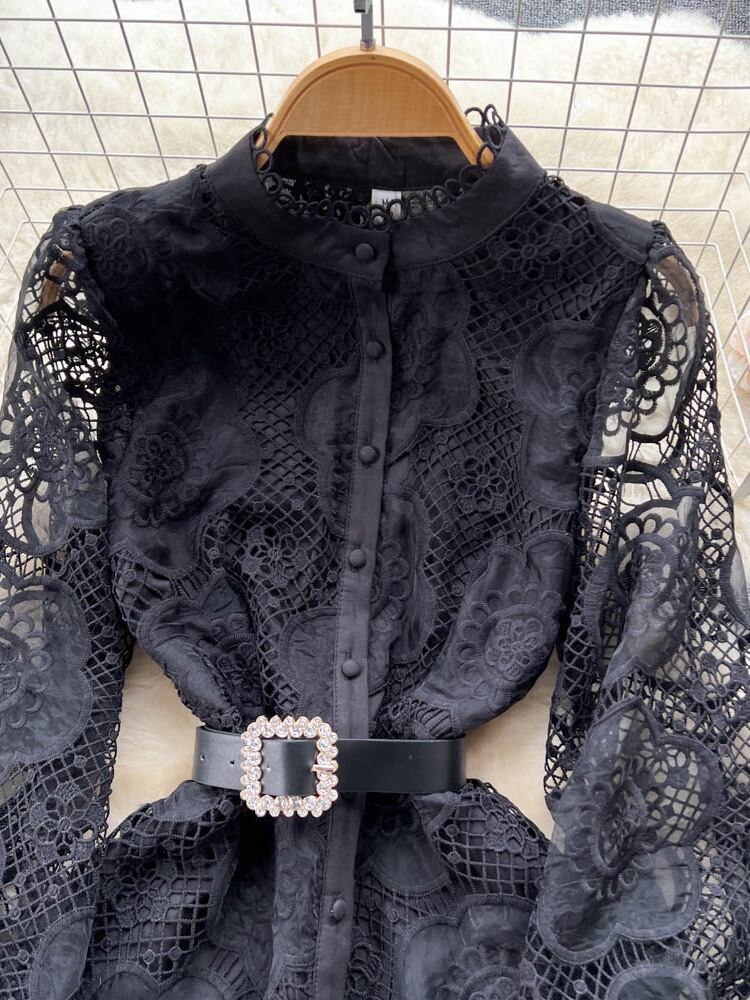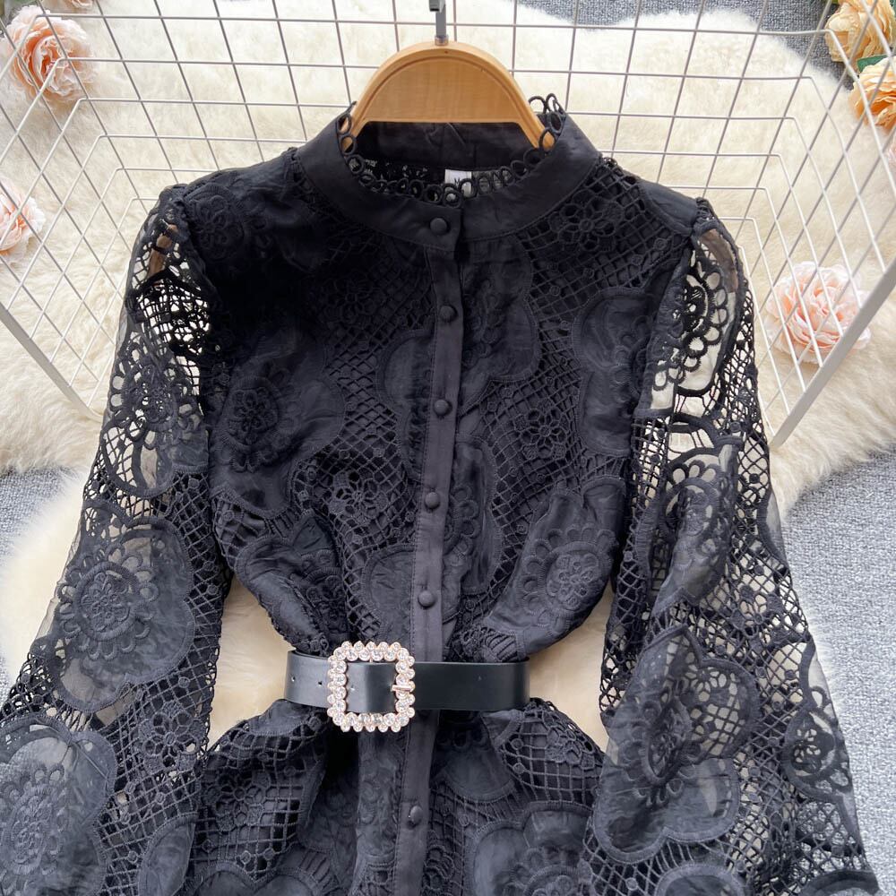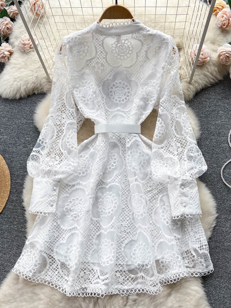 [EWQ] レース刺繍ドレスレースアップフックフラワーランタンスリーブパーティードレス春夏 Vestidos スプリング 春物 サマー 夏物 フラワーデザイン