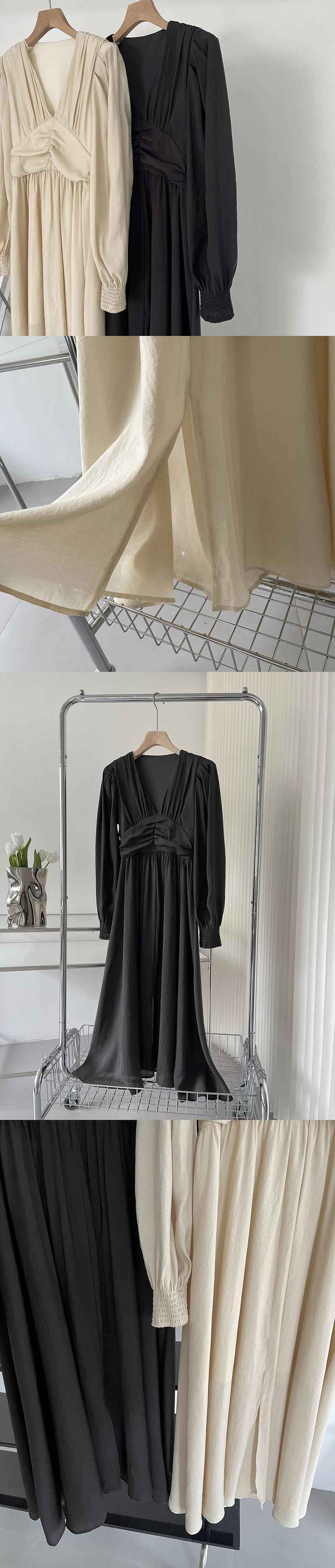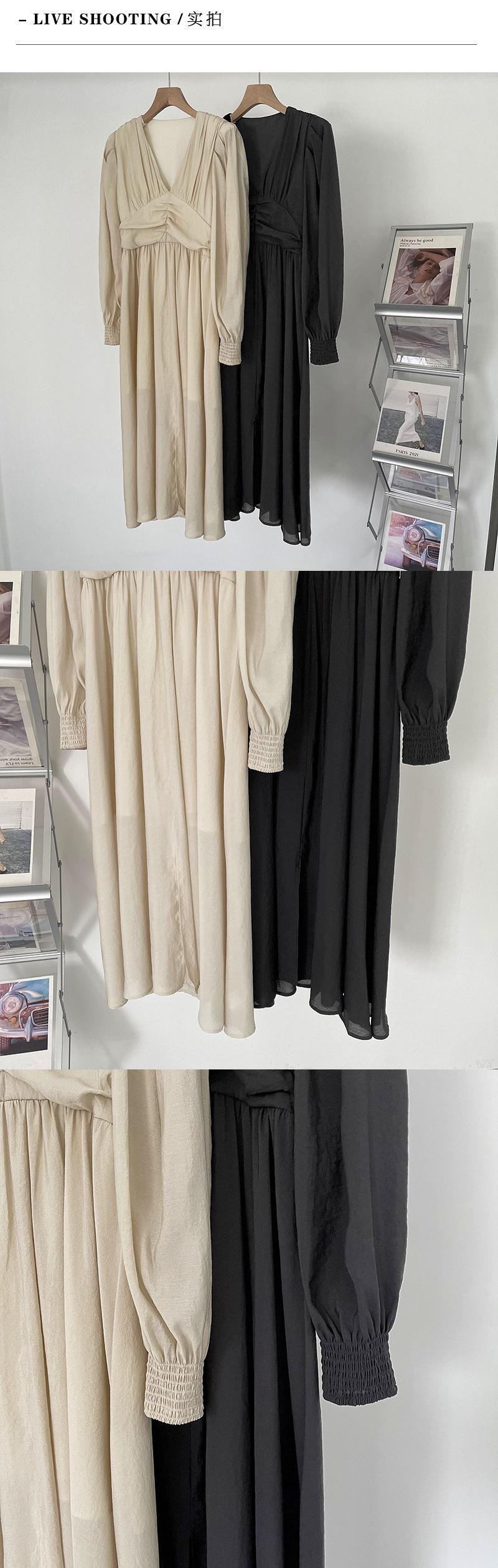 [EWQ] プリーツ V ネック ドレス ランタン スリーブ無地ドレス春夏 Vestido 16Y7854 ランタンスリーブ スプリング 春物 サマー 夏物 Vネック ソリッドカラー