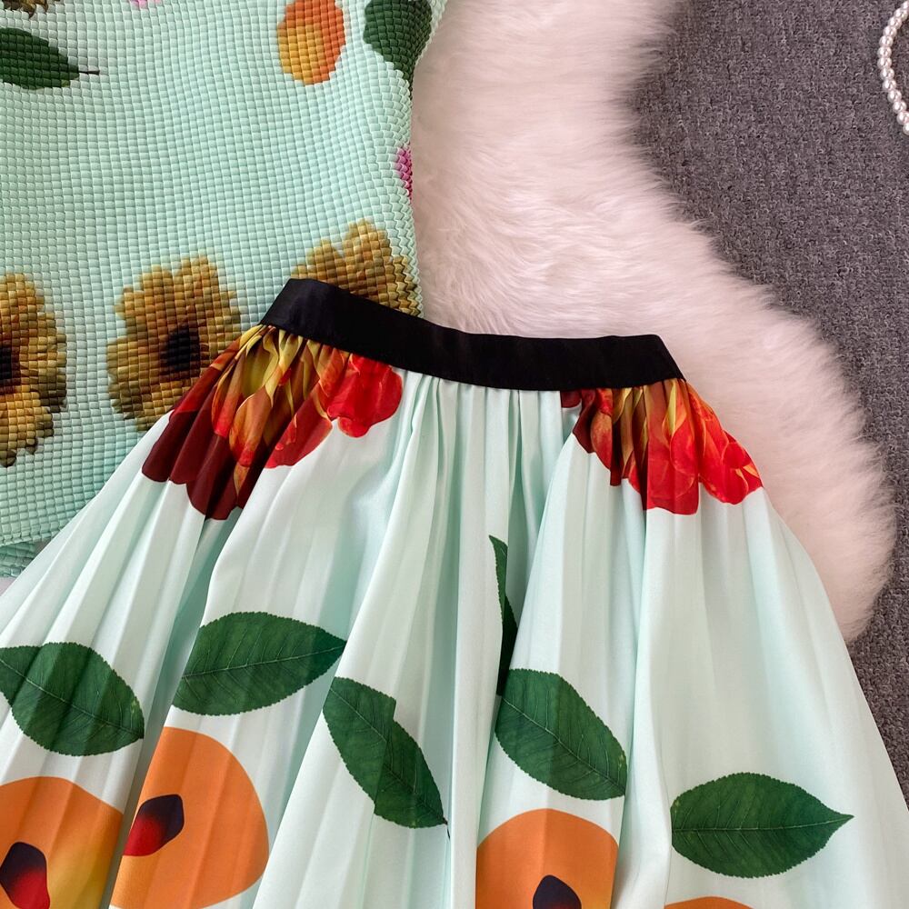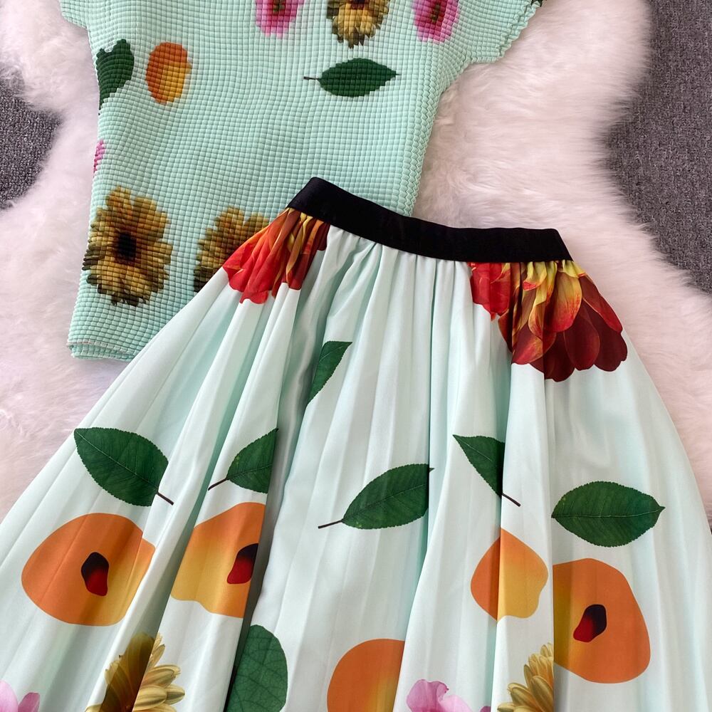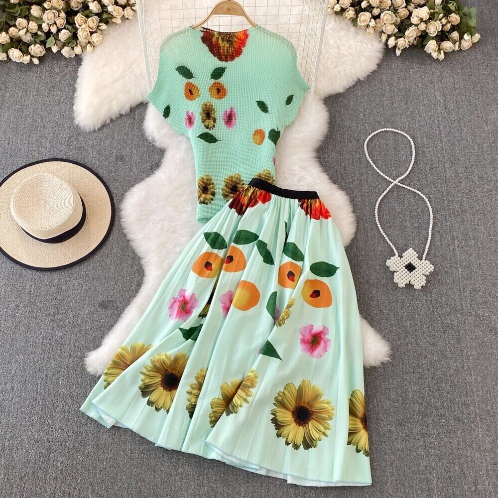 【EWQ】花柄プリントOネックシャーリングトップス ウエストゴムひだスカート ツーピーススーツ サマータイドビューティフルスーツ エラスティック 伸縮 夏物