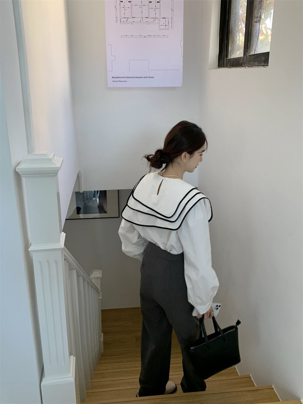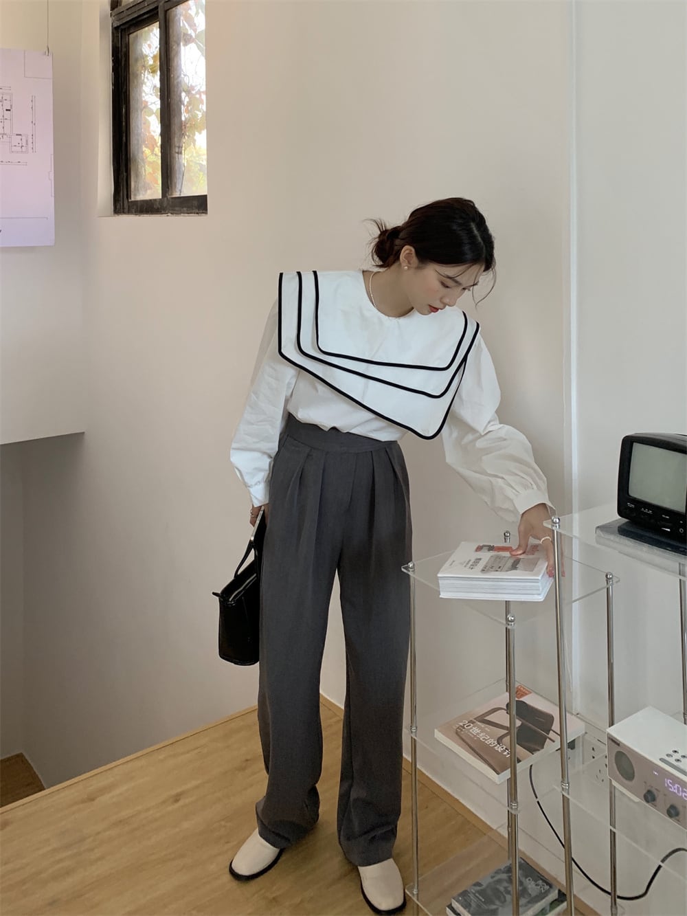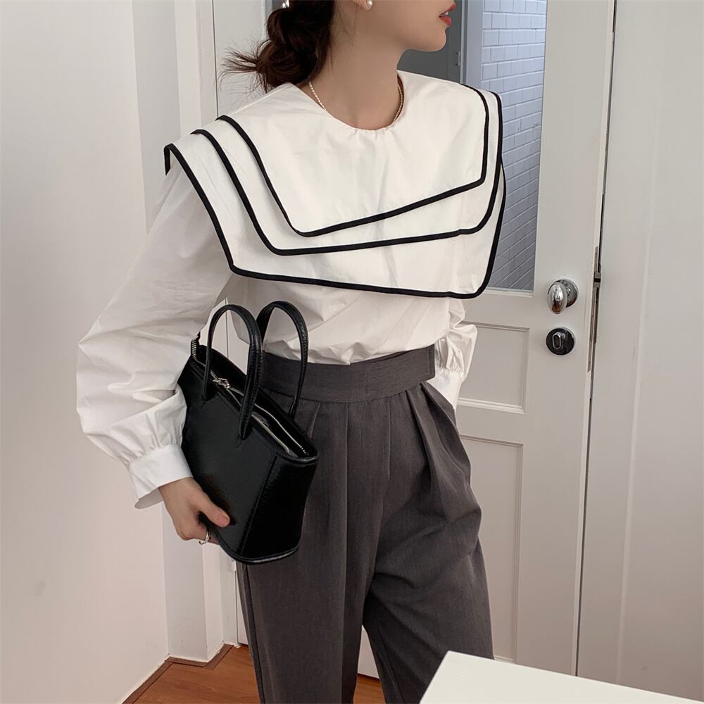 [EWQ] 甘いコントラスト エッジ三層セーラー襟不規則紫トップスルーズ ランタン スリーブ シャツ Wummer 春 ランタンスリーブ 大人ガーリー スウィート キュート カジュアル スプリング 春物 パープル