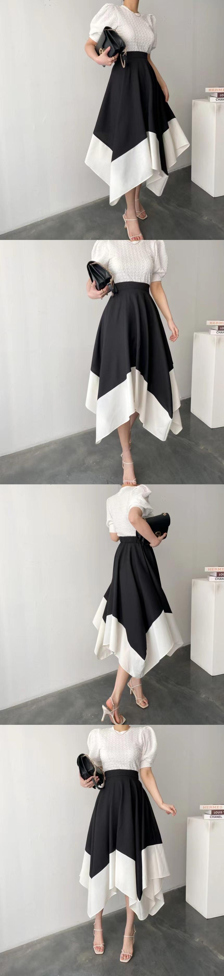 [EWQ] O ネック スリム フィット バブル スリーブ Tシャツ + ウエスト コントラスト イレギュラー A ライン スカート セット 夏 サマー 夏物 Oネック Aライン