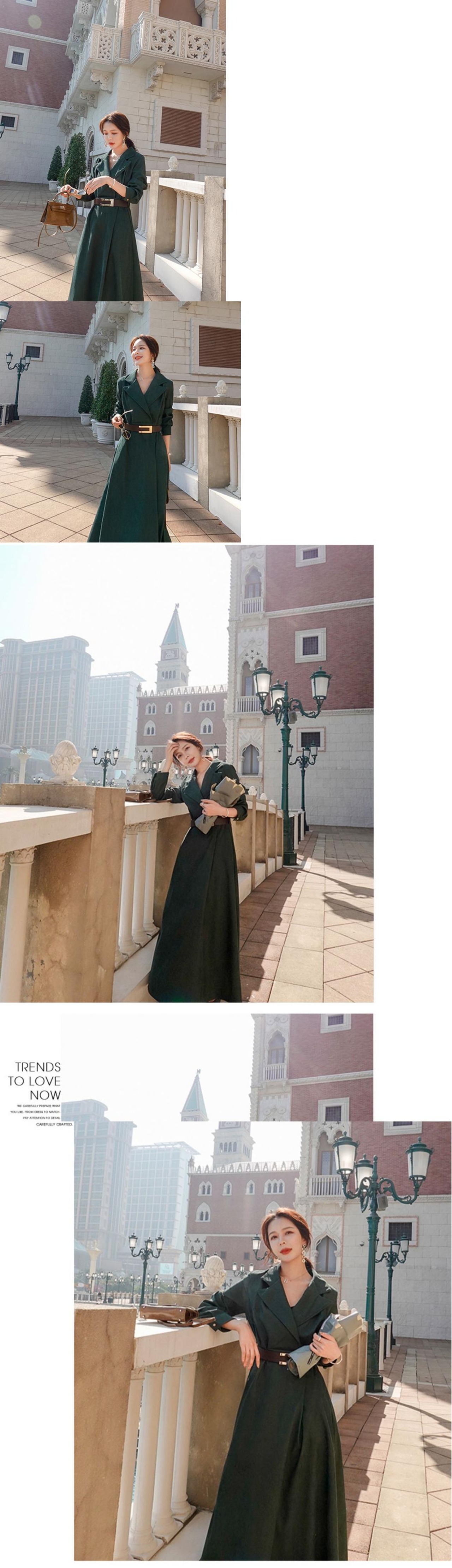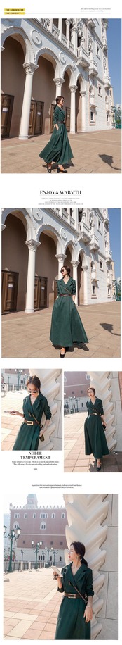 [EWQ] シック ルーズ ウエスト ビッグ ヘム ランタン ロング スリーブ ドレス ベルト付き V ネック ミッドカーフ レディース ダーク グリーン 服 20022 秋 長袖 オータム 秋物 ハーネス Vネック