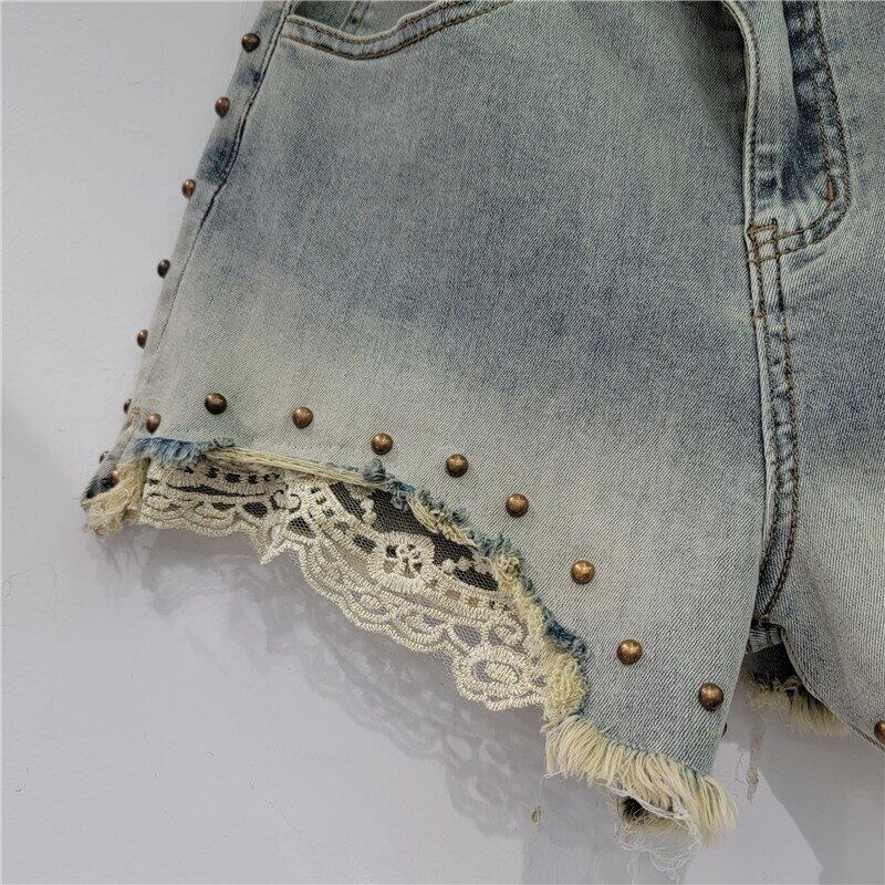 [EWQ] リベット デニム ショーツ レース スプライシング パッチワーク ストリート ウエスト サマー タイド ショート ホット ジーンズ 夏物 ブルマー