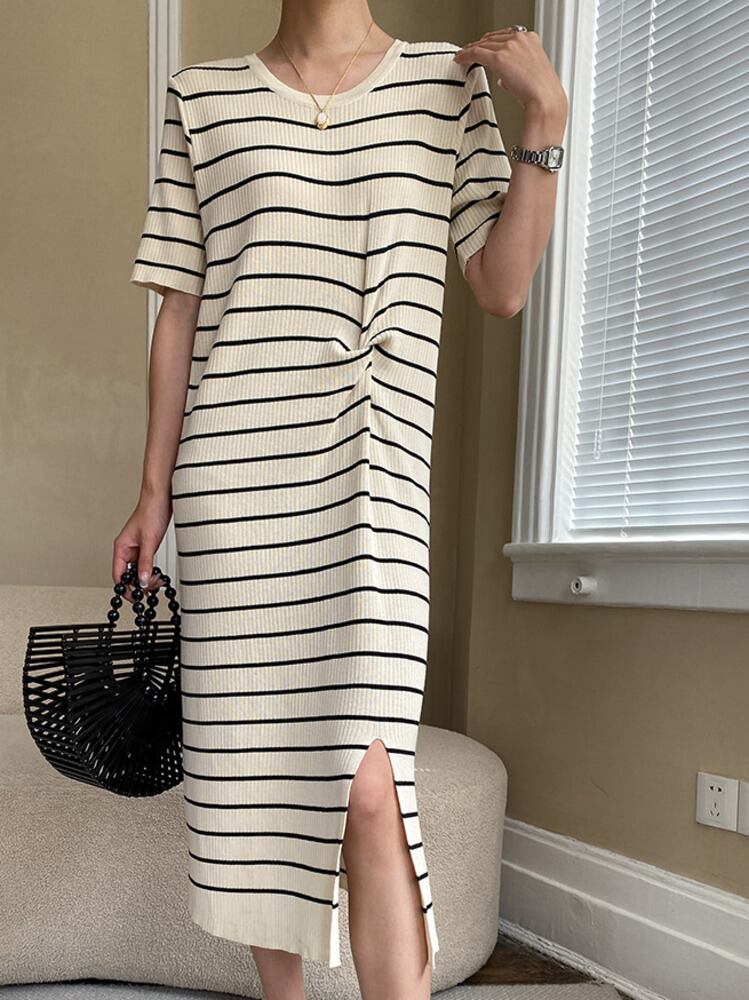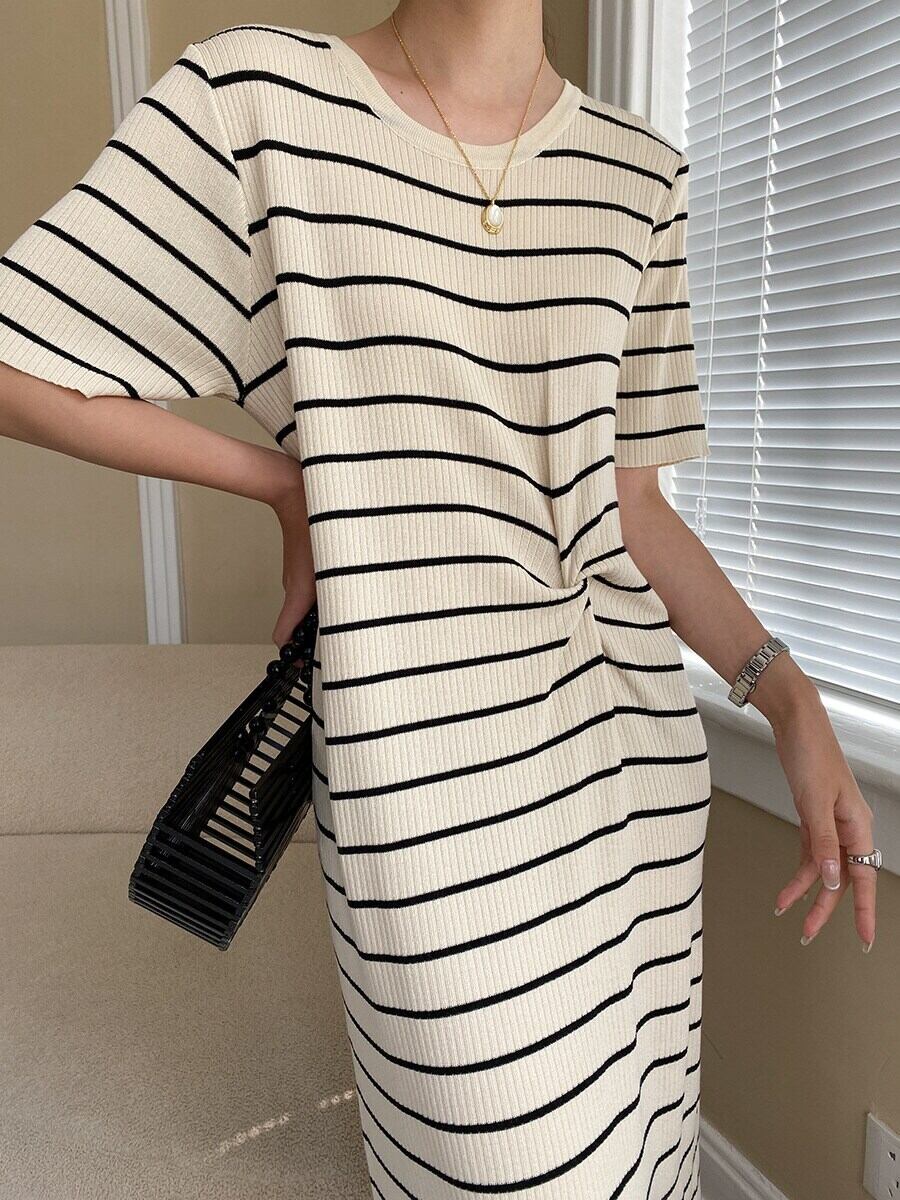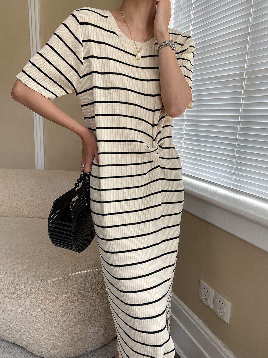 [EWQ] ストライプ ニット ドレス O ネック分割ネクタイ半袖コントラスト カラー ニット ドレス夏潮 Vestido ショート ハーフスリーブ サマー 夏物 Oネック