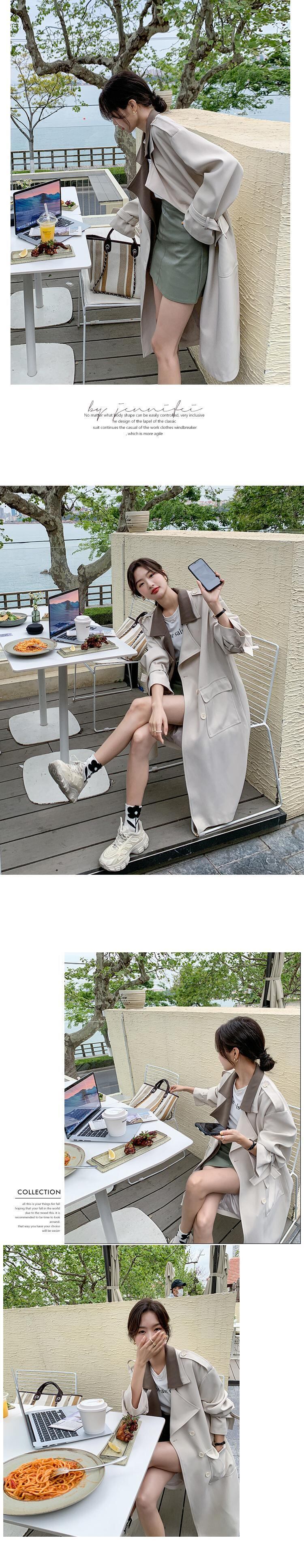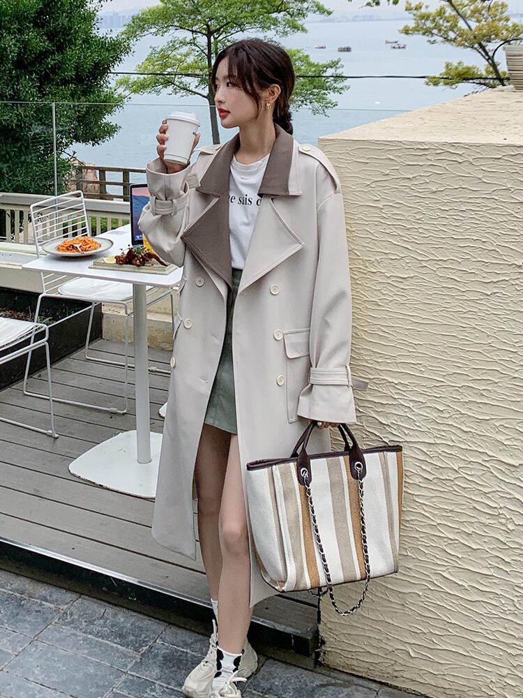 【EWQ】シックベージュカラーブロック トレンチコート アウター 長袖 ウインドブレーカー 春 レディース ロング スプリング 春物