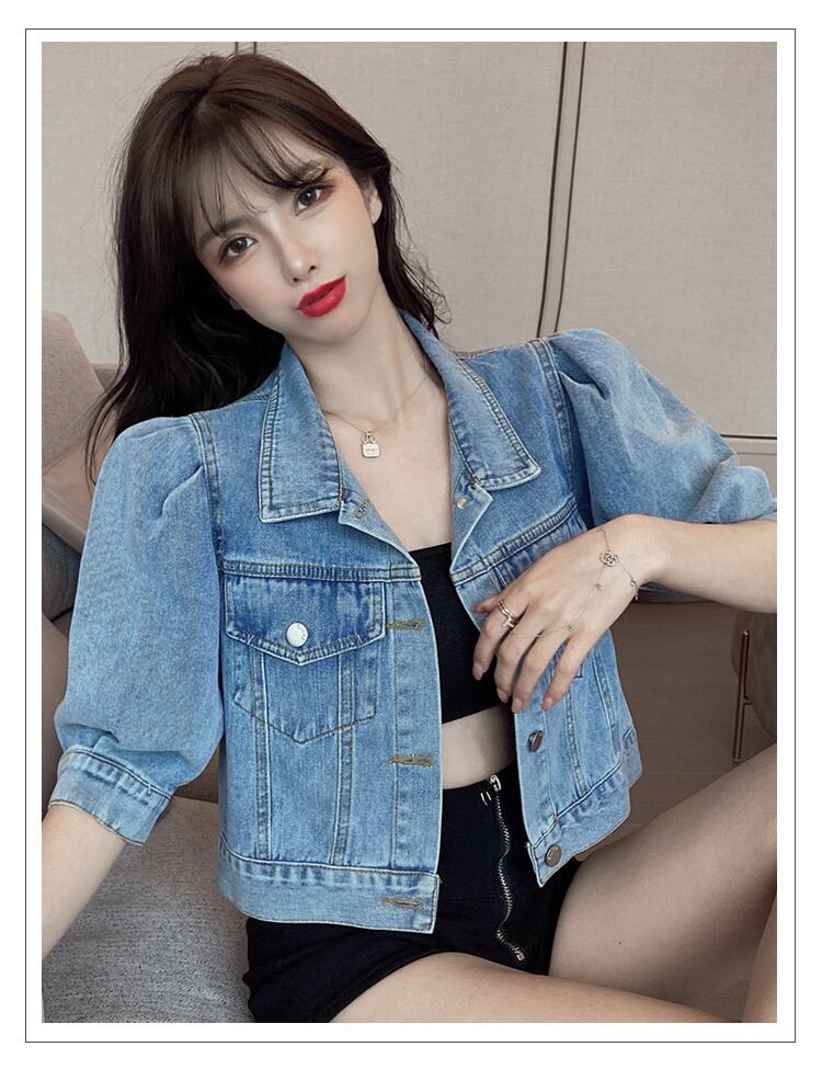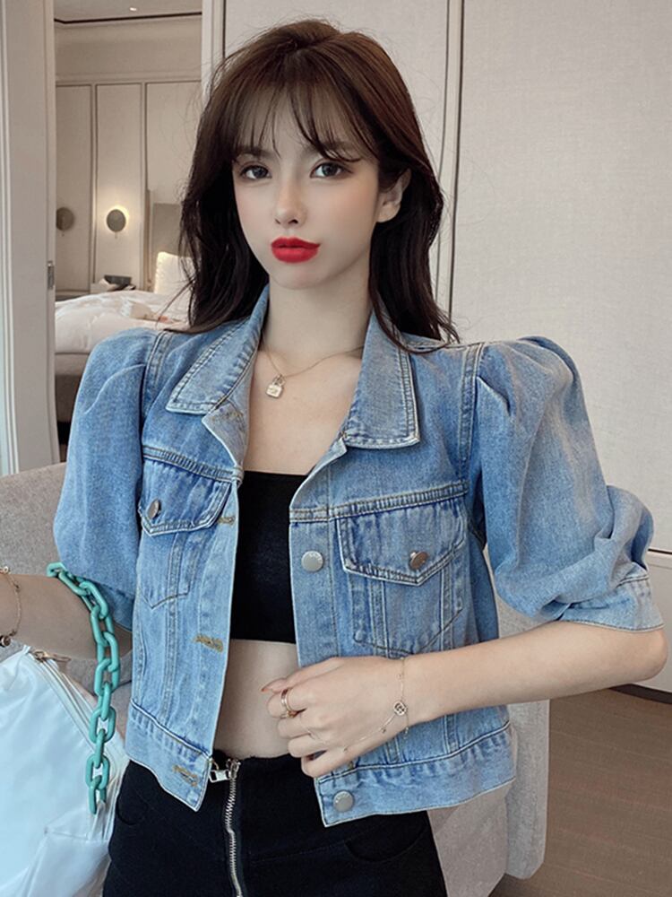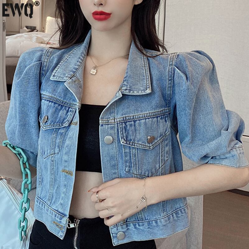 [EWQ] パフ スリーブ シングル ブレスト ショート デニム ジャケット夏潮ラペル ブルー ジャケット コート トップ Y8157 サマー 夏物