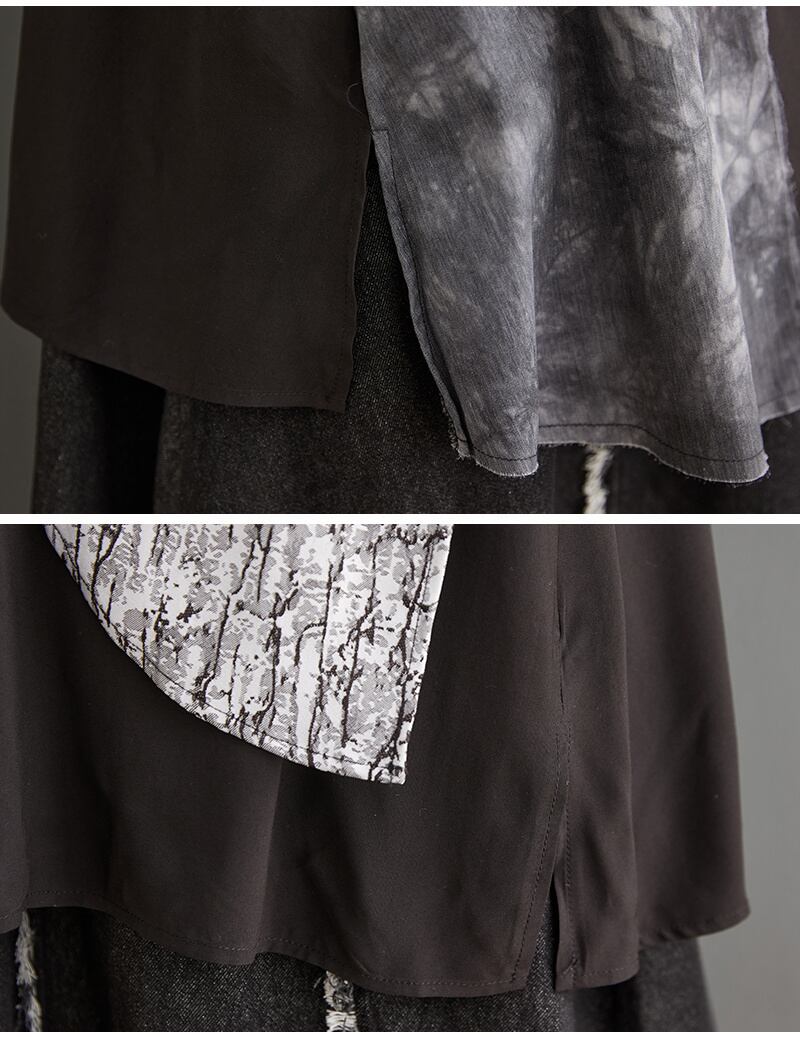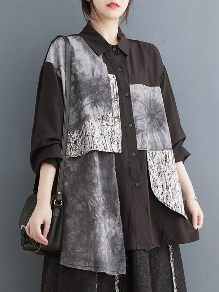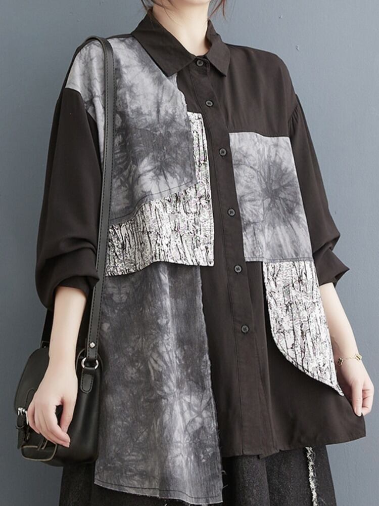 【EWQ】スプライシング コントラストカラー トレンド レディース ビッグサイズ 黒シャツ イレギュラーヘム ブラウス 夏 ブラック サマー 夏物