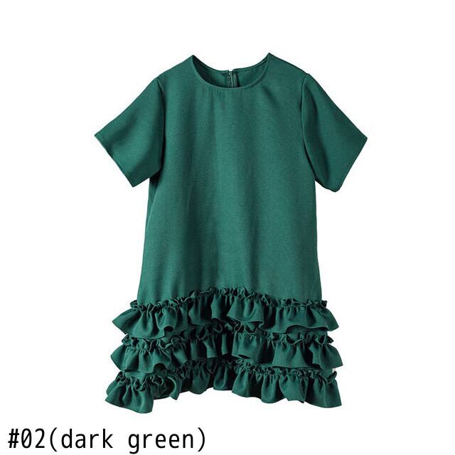 [EWQ] グリーンフリルスプライスミニドレス半袖無地ルーズドレス夏 Tシャツ Vestido 900 ショート ハーフスリーブ サマー 夏物 ソリッドカラー
