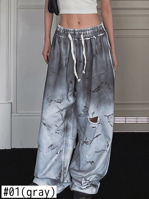 [EWQ] グラデーション絞り染めズボンウエストゴム巾着壊れ穴ストレートワイドレッグパンツ春夏潮 エラスティック 伸縮 スプリング 春物 サマー 夏物 ワイドパンツ