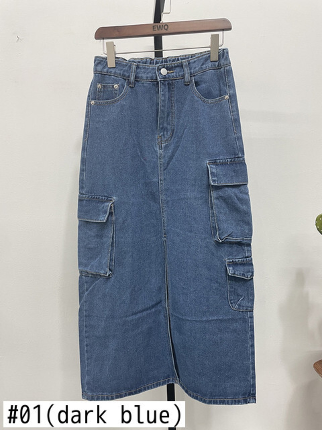 [EWQ] 3D ポケット スプリット デニム スカート ウエスト ストリート ミッドカーフ スカート サマー タイド ブルー ファルダス 994 夏物