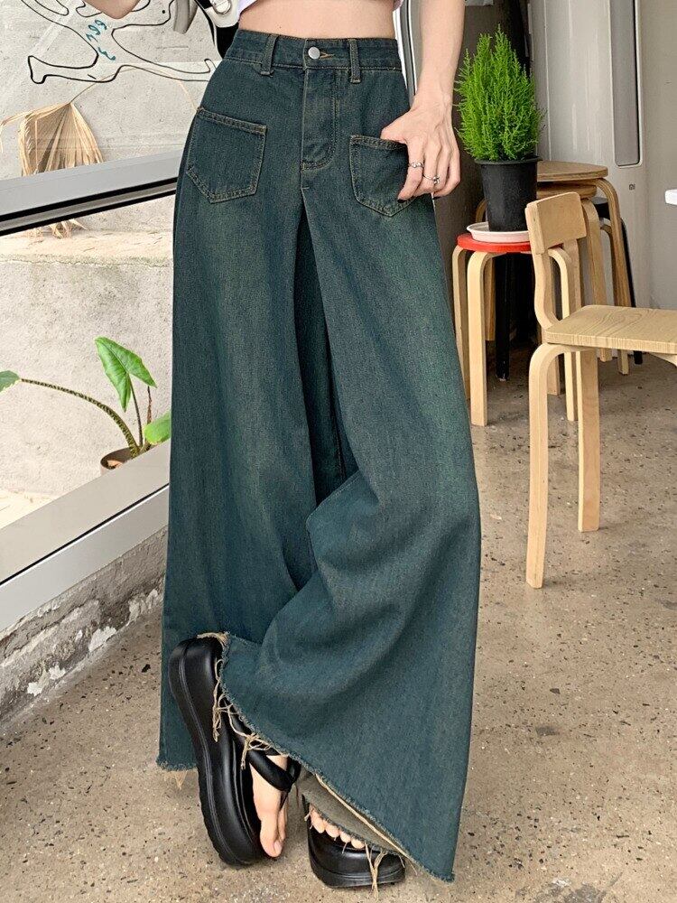 [EWQ] ストリート デニム パンツ ウエスト Tel 特大ポケット ワイドレッグ ジーンズ春夏潮ズボン スプリング 春物 サマー 夏物 ワイドパンツ