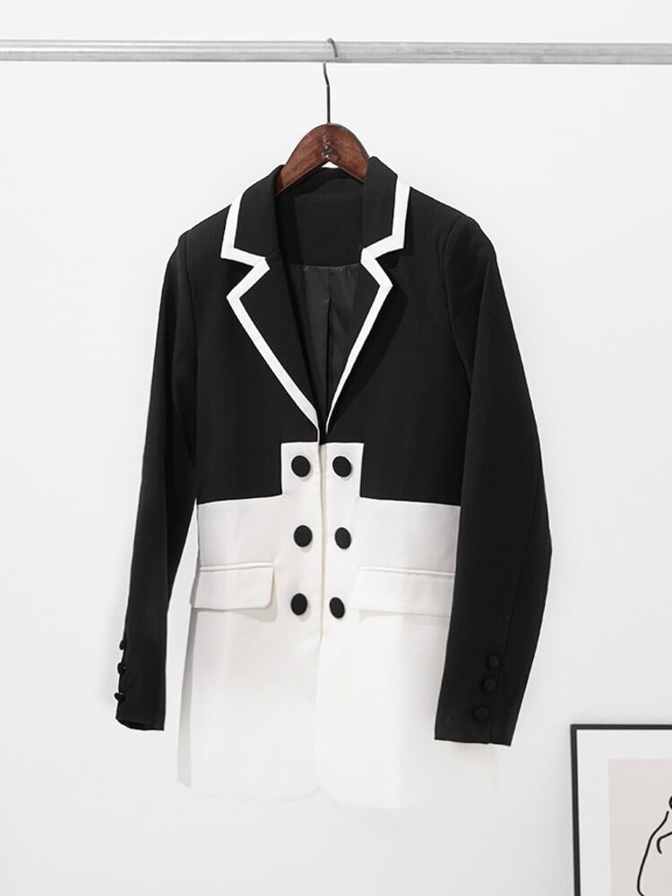 【EWQ】シックレディースブレザーノッチカラーパッチワークダブルブレストロングスリーブスプライシングスーツジャケット春秋 長袖 スプリング 春物 オータム 秋物