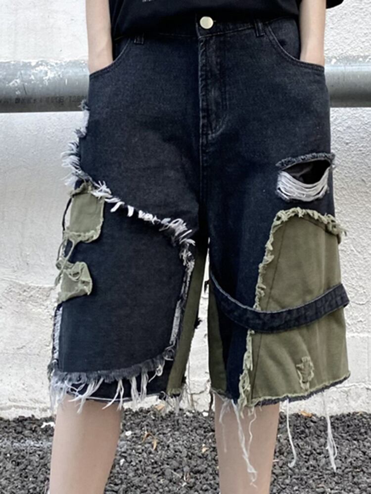 [EWQ] ストリート デニム ショーツ ウエスト パッチワーク Tel コントラスト ホット ショート ジーンズ サマー タイド 92 夏物 ブルマー