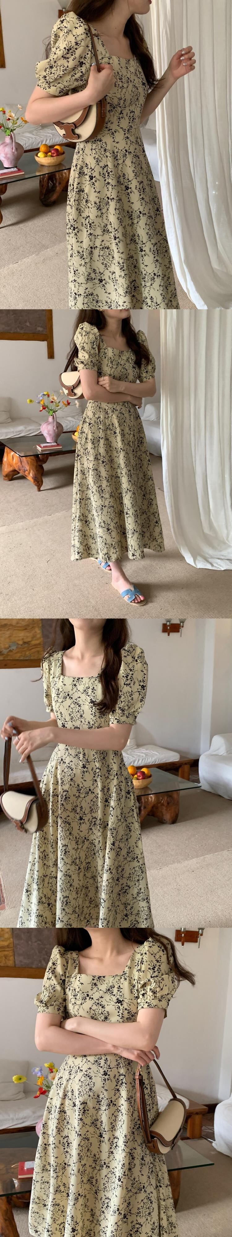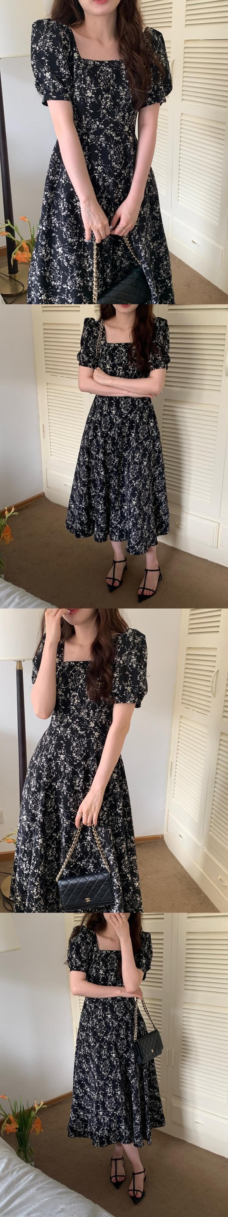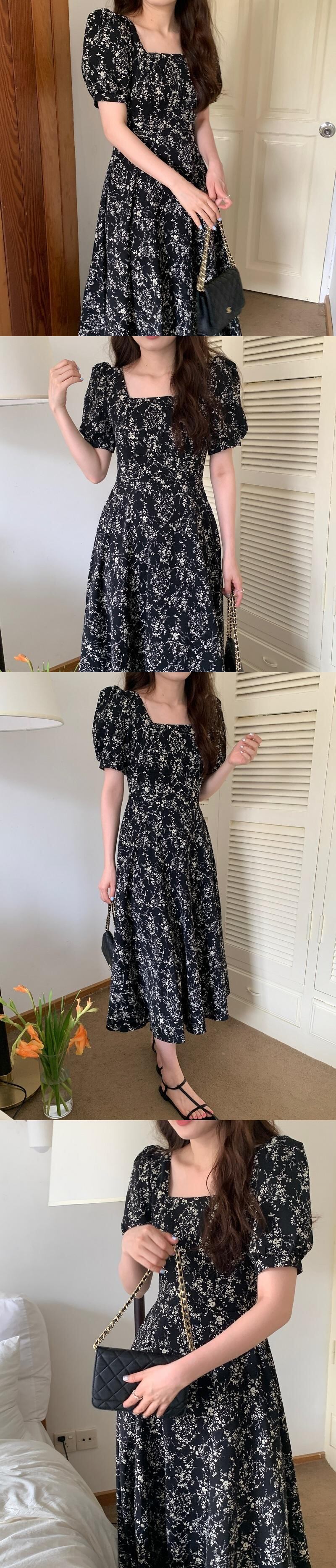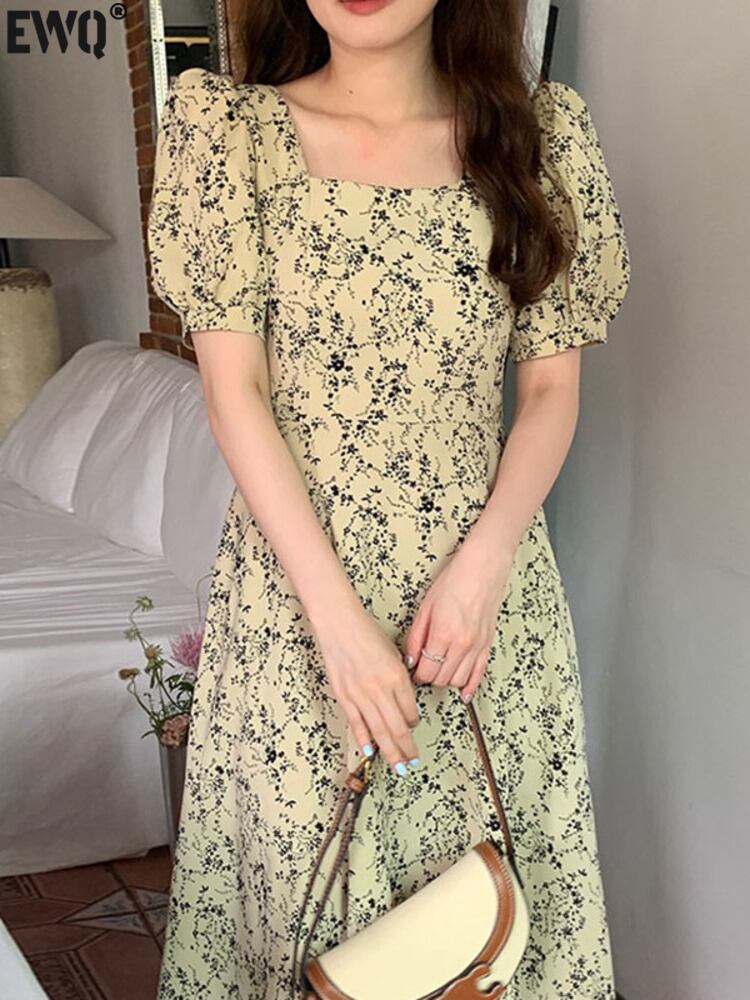[EWQ] カラフルプリント ドレススクエア ネック因果パフ スリーブ ドレス夏潮 Vestido サマー 夏物 スクウェア