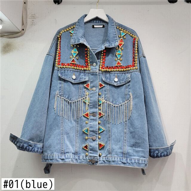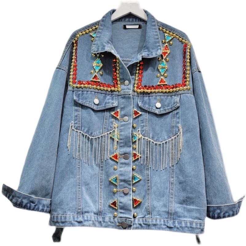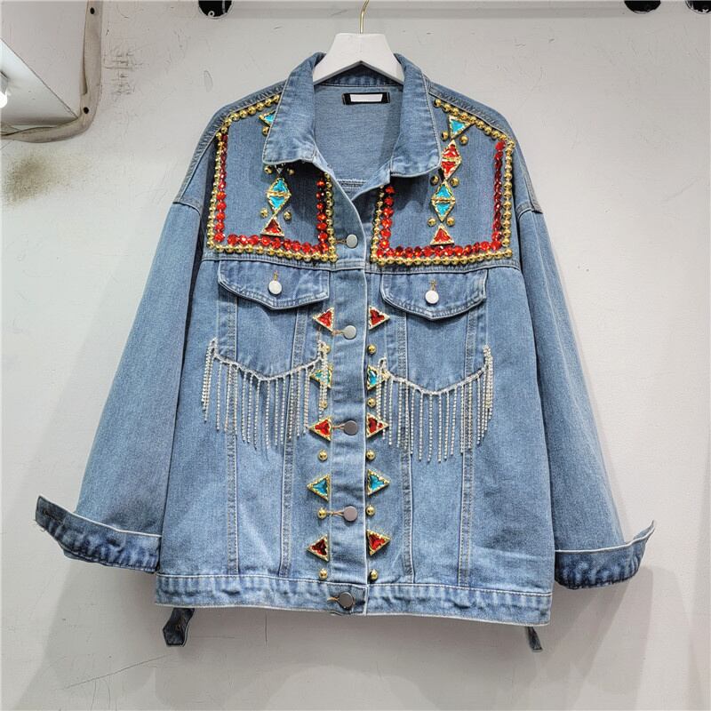 [EWQ] ストリート デニム ジャケット カラフル ビーズ電話ダイヤモンド潮ジャケット コート春秋長袖 Outwears ロング スプリング 春物 オータム 秋物