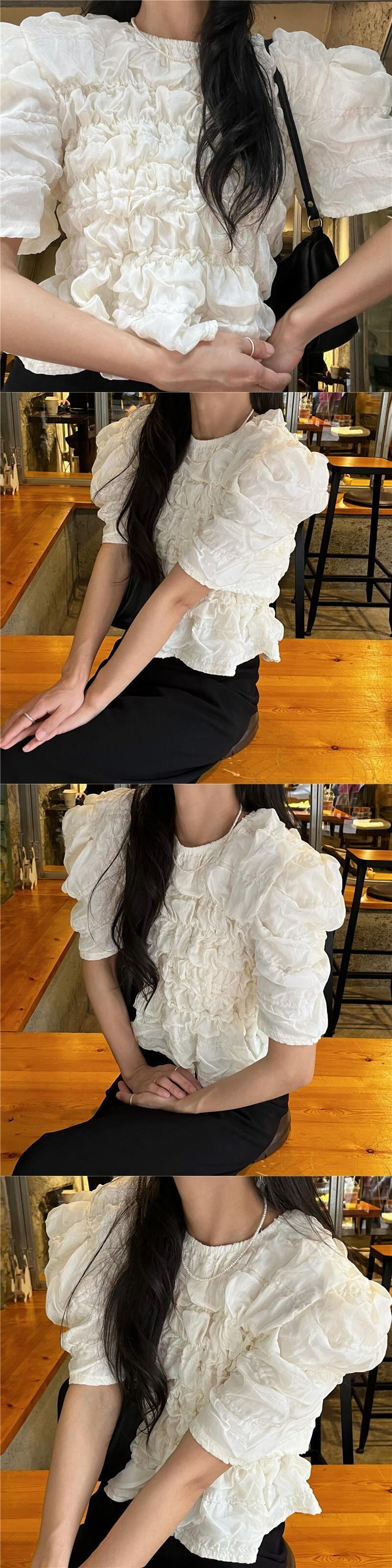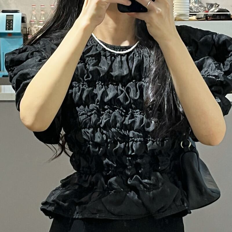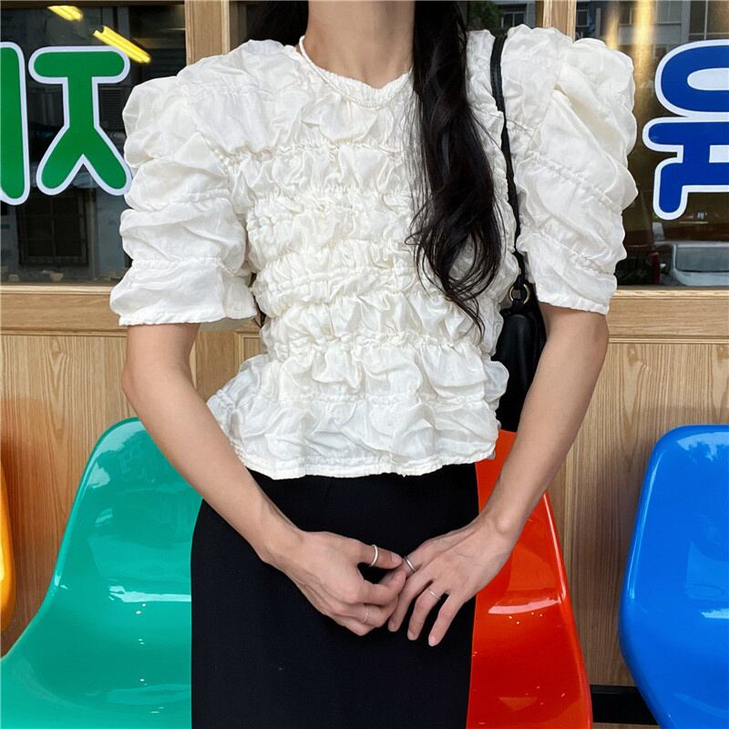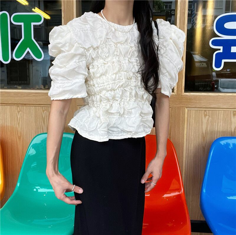 [EWQ] プリーツバブルチェック無地シャツパフスリーブ白トップ夏潮オールマッチ服 855 ホワイト サマー 夏物 ソリッドカラー