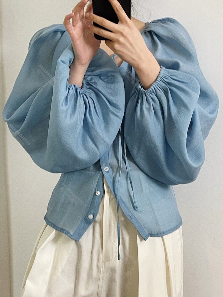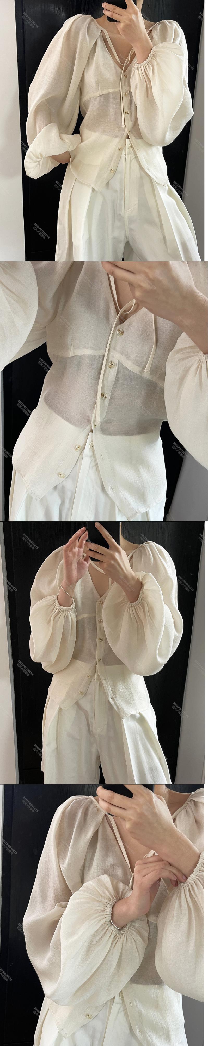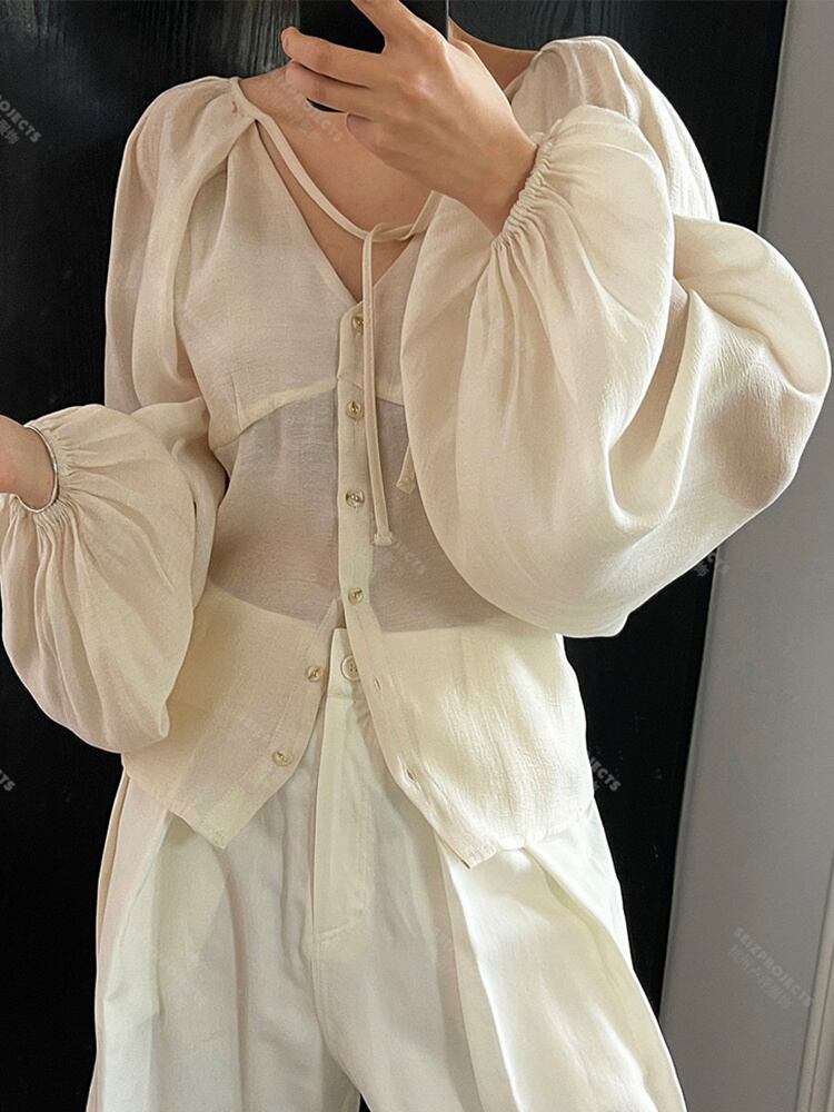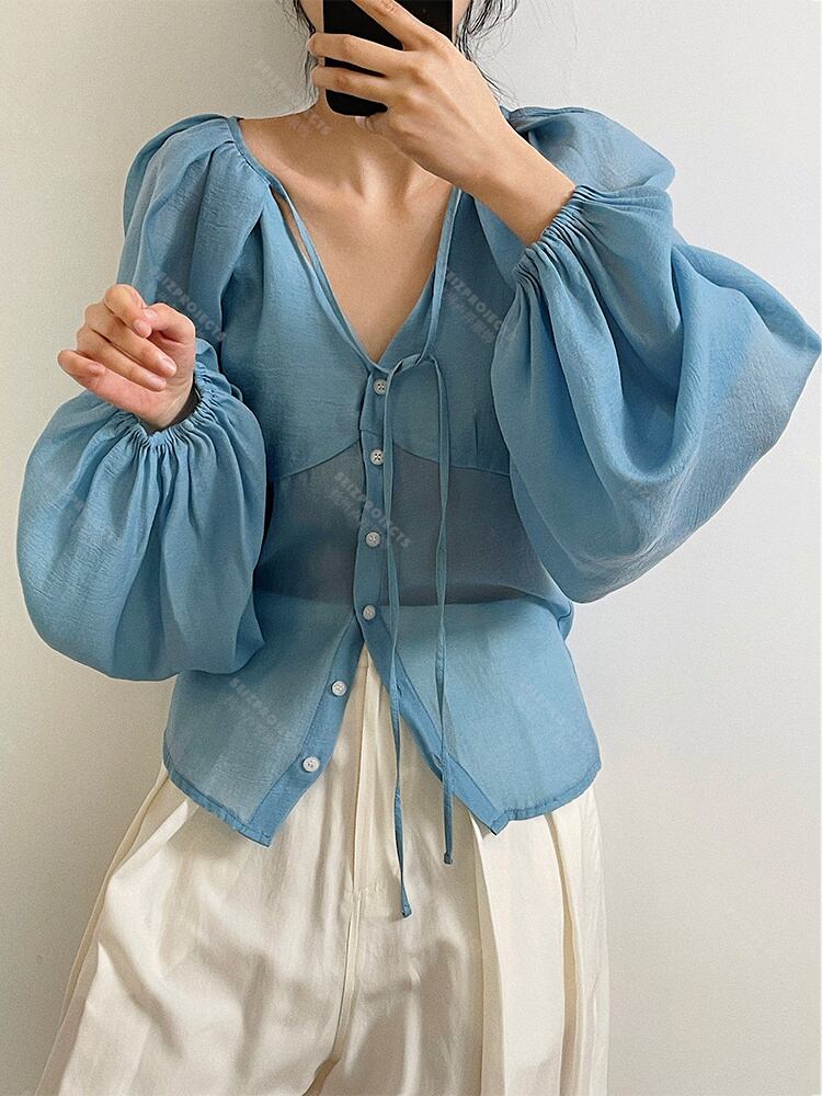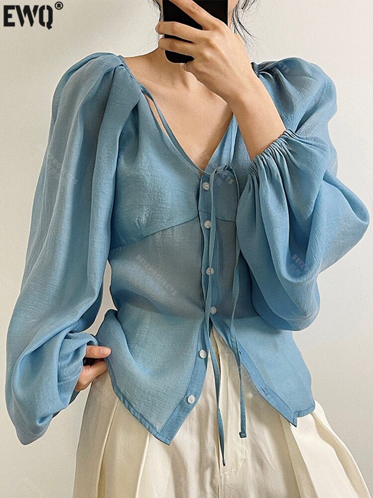 【EWQ】 無地 レースアップ 透視シャツ レディース ベーシック スリム Y2k 長袖 ブラウス サマートップス 23A619 ロング 夏物 ソリッドカラー