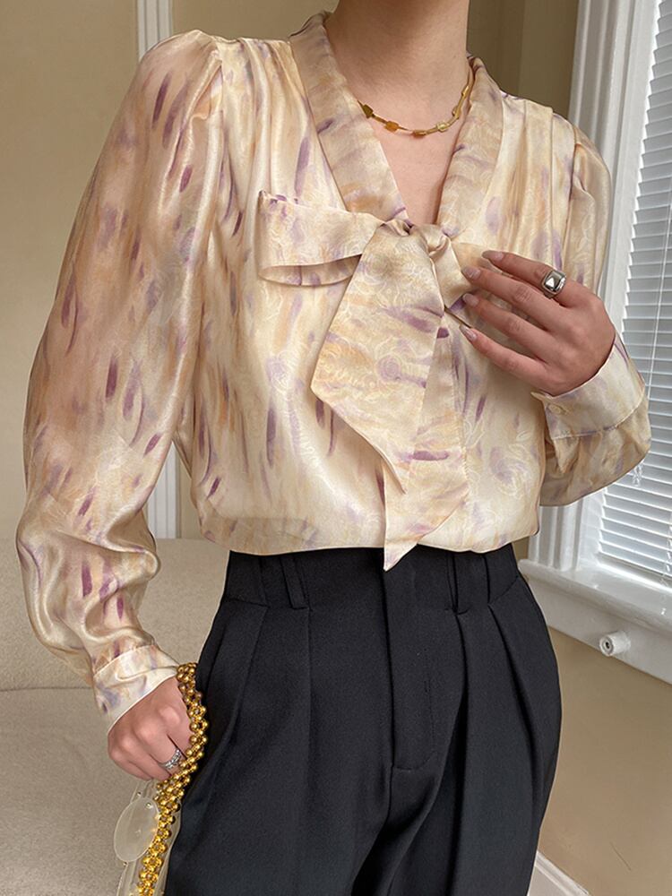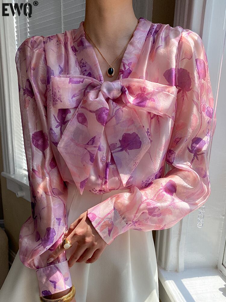 [EWQ] フローラル プリント レース アップ Ttie シャツコントラスト カラー ブラウス夏潮 サマー 夏物 花柄 レースアップ