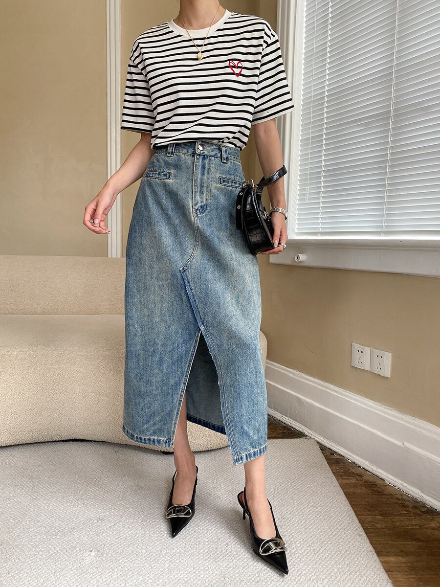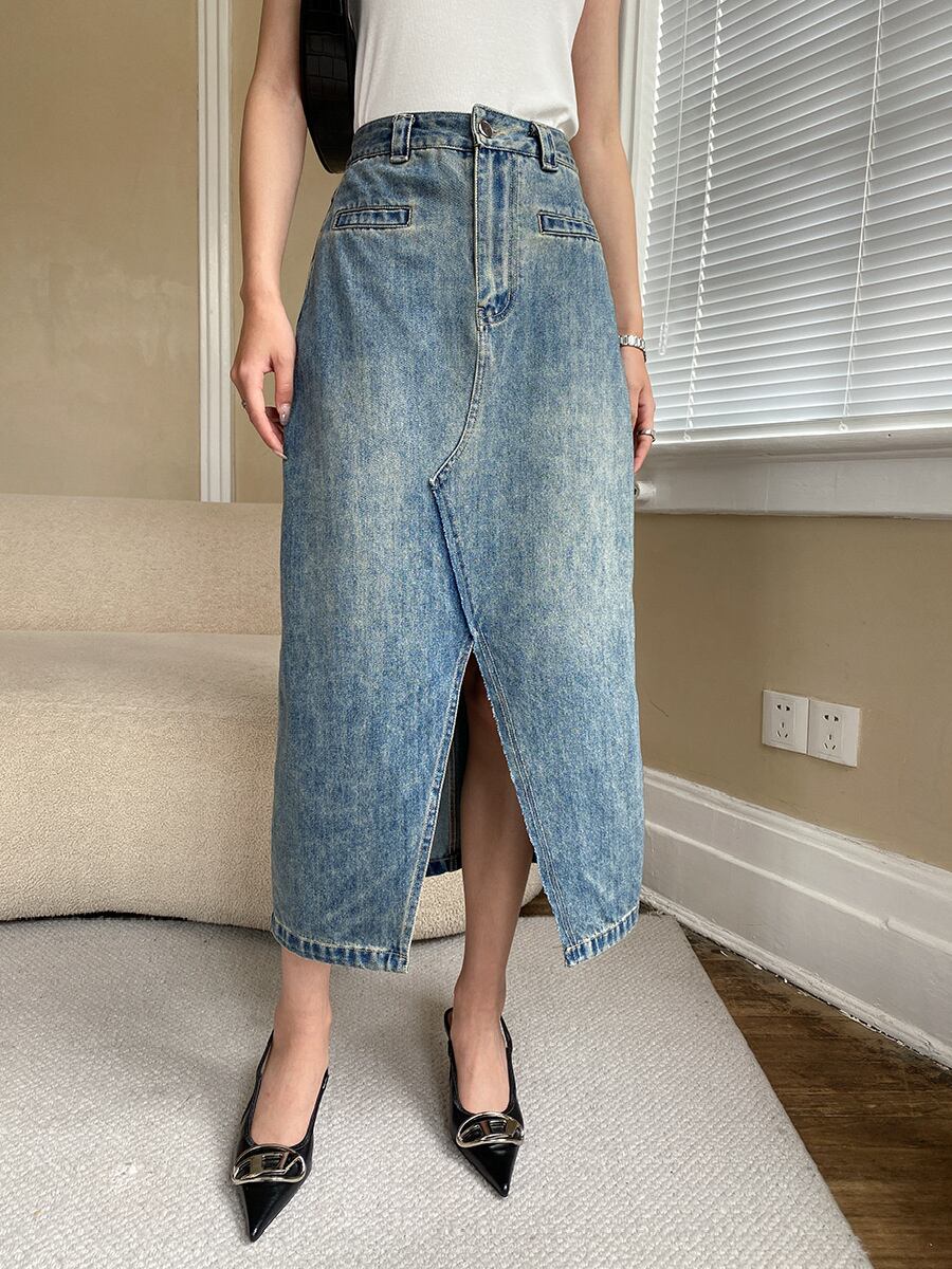 [EWQ] 不規則スプリット デニム スカート ウエスト ストリート コントラスト カラー ミッドカーフ スカート 夏潮ファルダス サマー 夏物