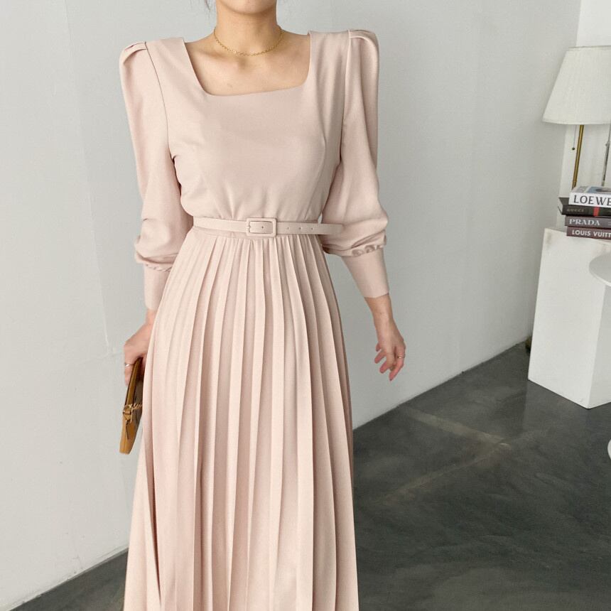 [EWQ] シンプル無地スクエアカラーロングスリーブドレスプリーツルーズウエストドレス夏 16Y1274 長袖 サマー 夏物 ソリッドカラー スクウェア