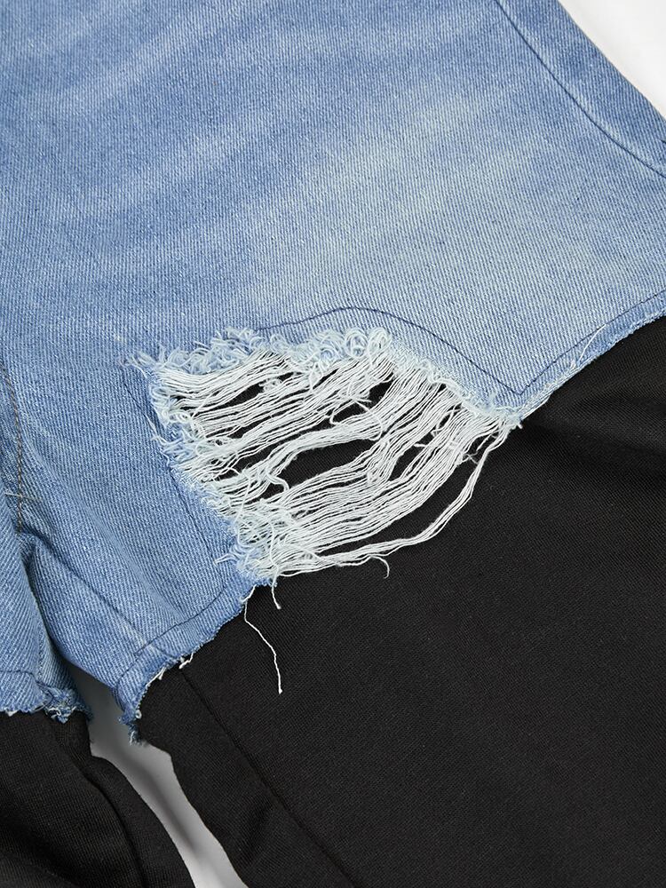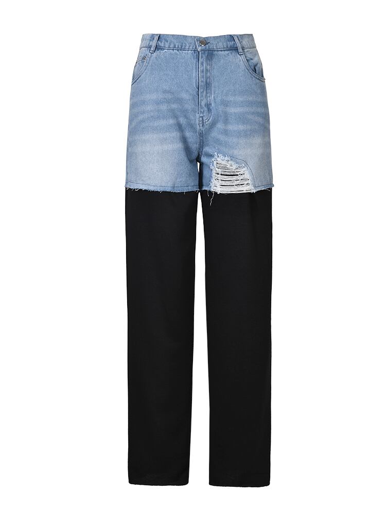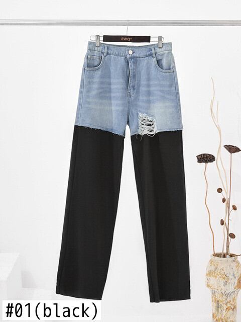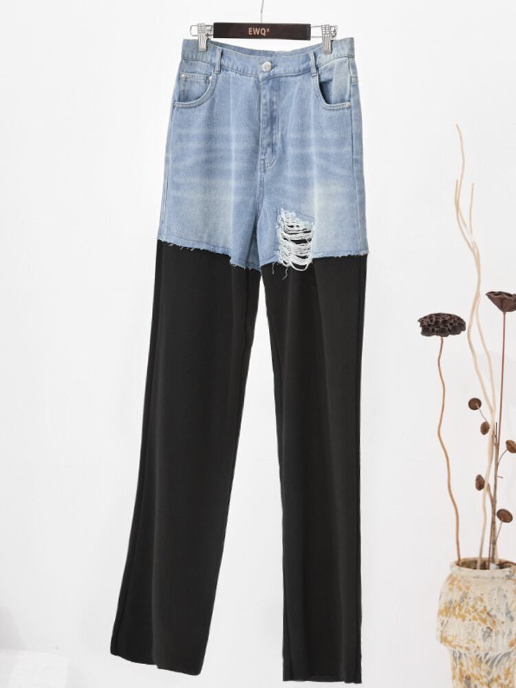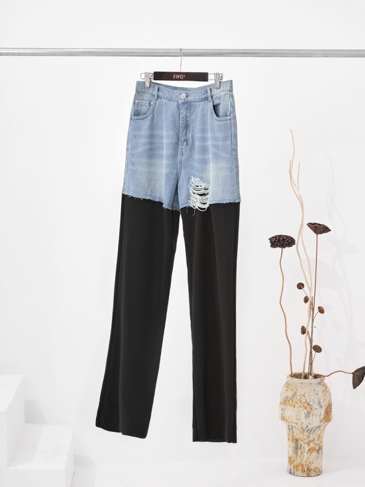 [EWQ] 春夏潮デニムパッチワークワイドレッグパンツコントラストストリートウエストストレートズボン 16Y7227 スプリング 春物 サマー 夏物 ワイドパンツ