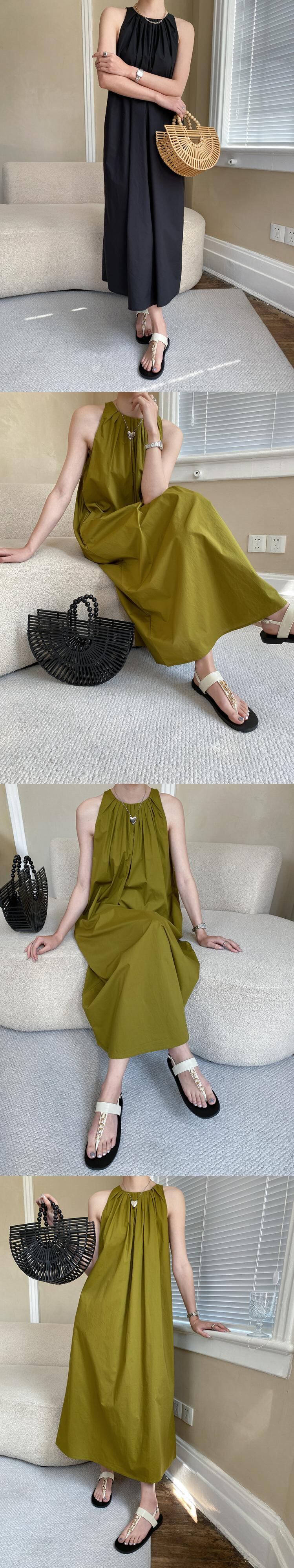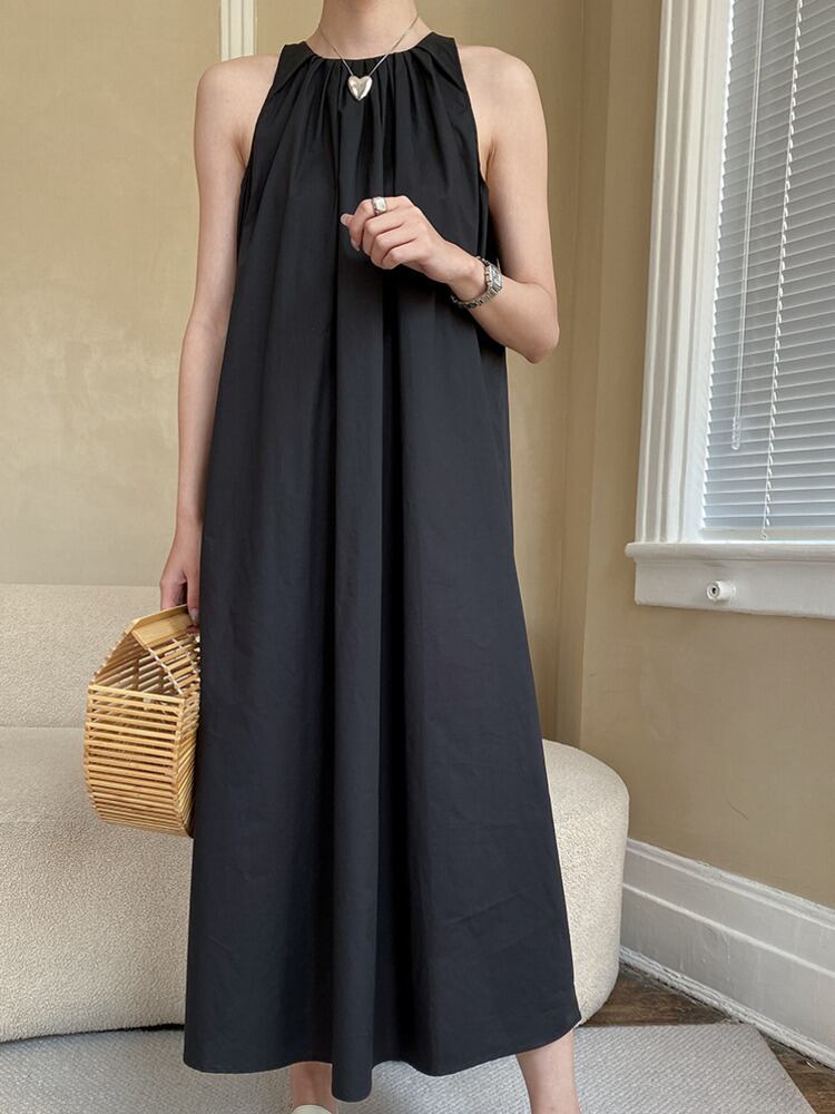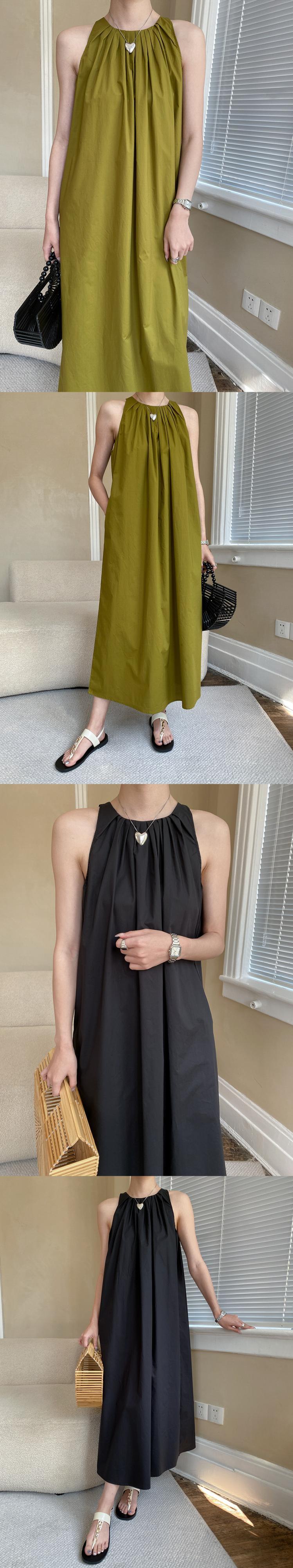 [EWQ] プリーツ A ライン スリング ドレス夏潮ノースリーブ ルーズ カジュアル ロング ドレス グリーン Vestidos サマー 夏物 Aライン