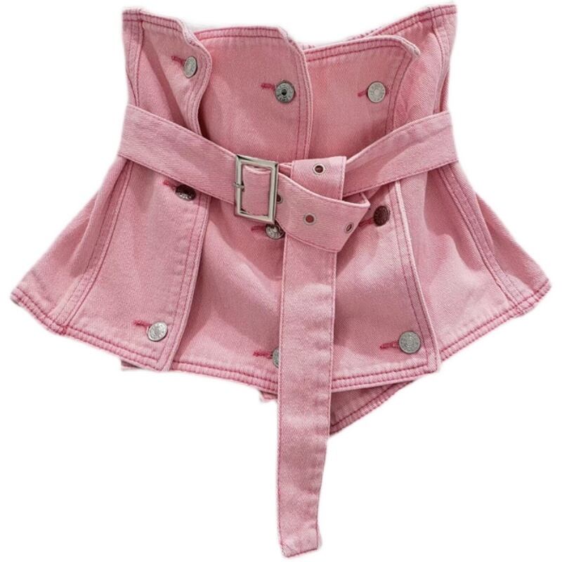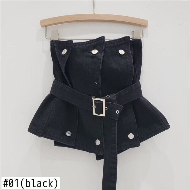 [EWQ] プリーツ パッチワーク ノースリーブ デニム ベストセクシー スリム レースアップ ウエスト ボトム ラップ トップ夏潮 213 サマー 夏物