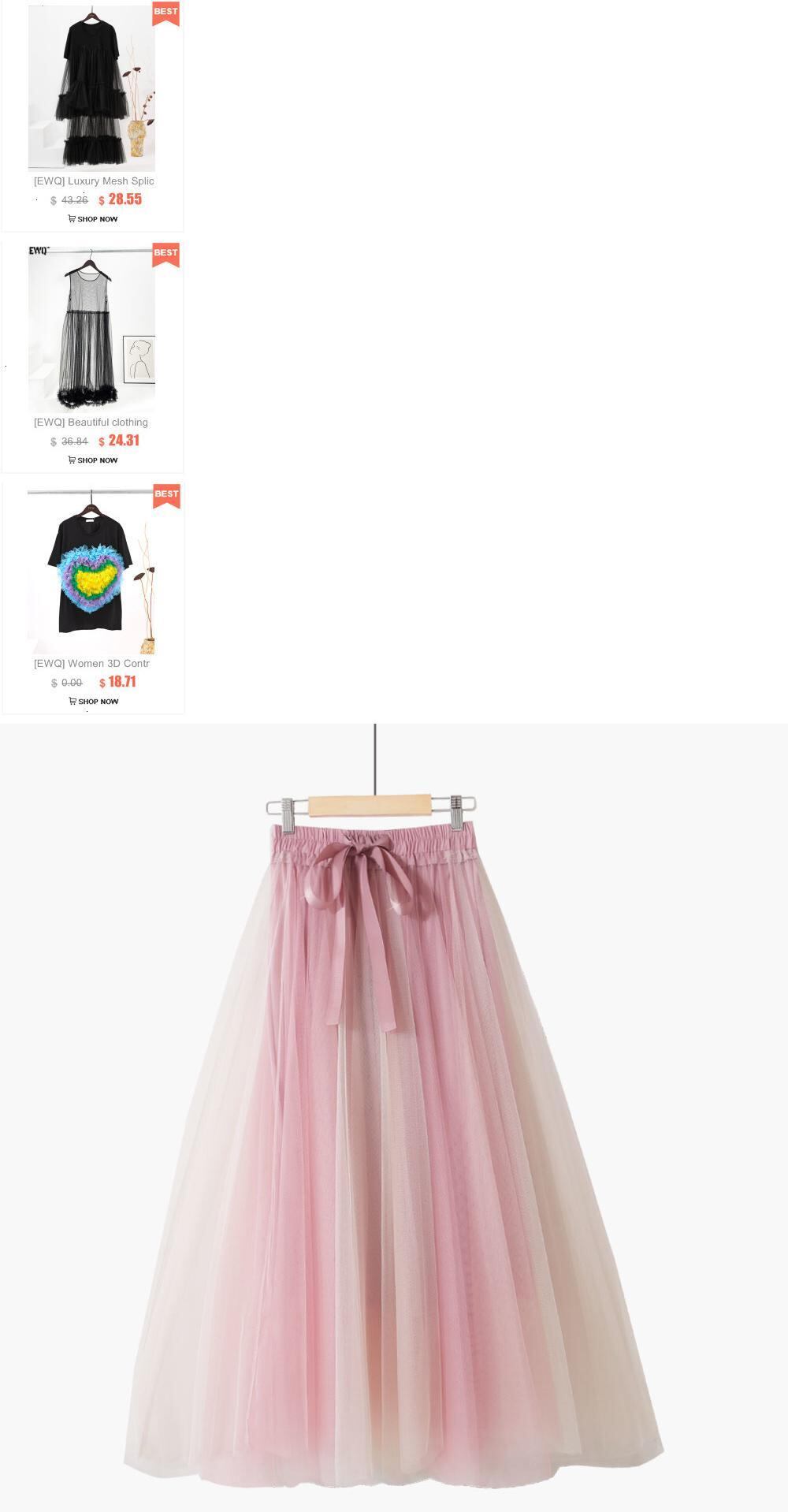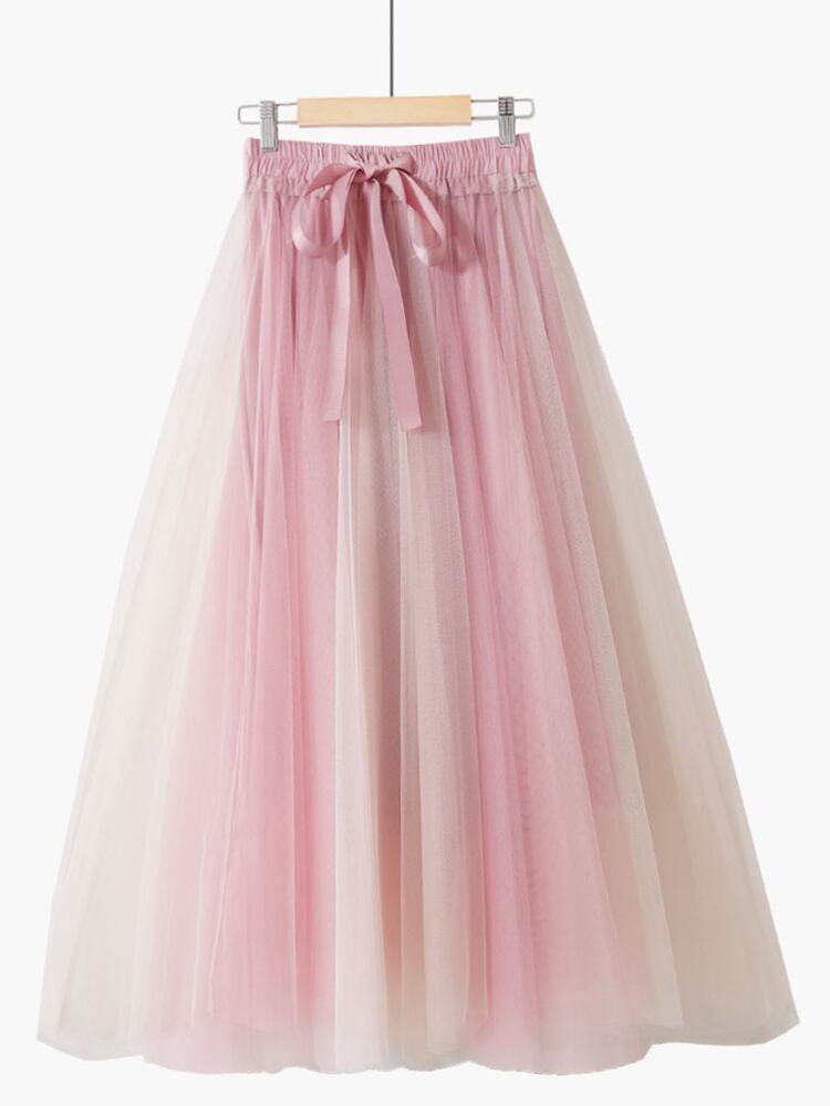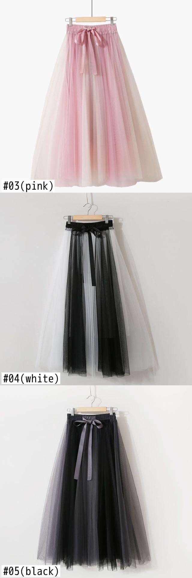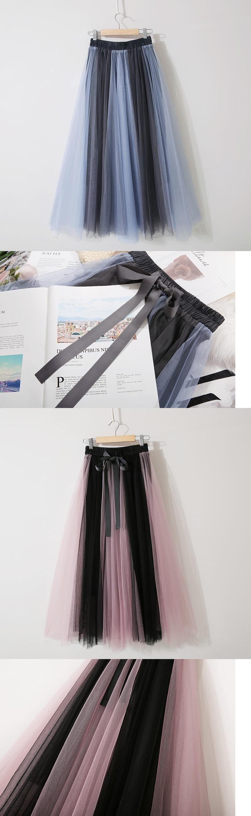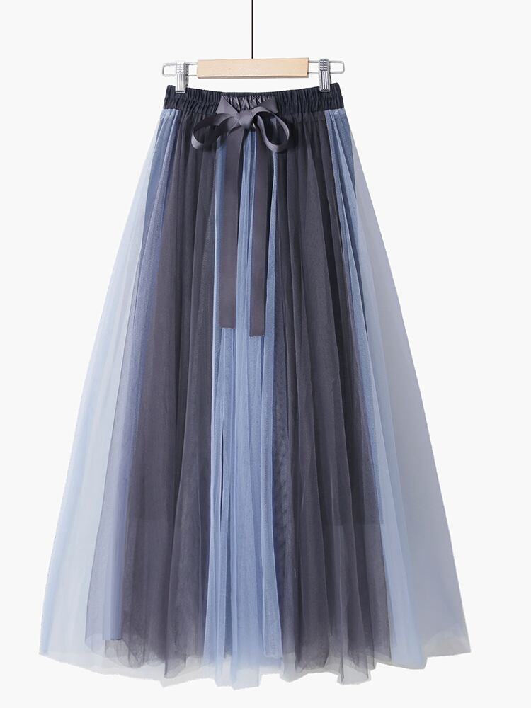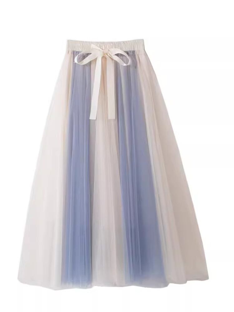 [EWQ] 甘いコントラストカラーメッシュスカート夏潮ウエスト弾性蝶ネクタイミッドカーフスカート段 Faldas リボン エラスティック 伸縮 大人ガーリー スウィート キュート カジュアル サマー 夏物