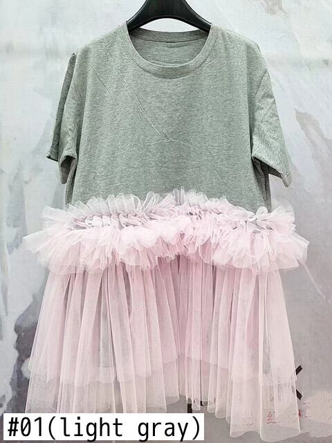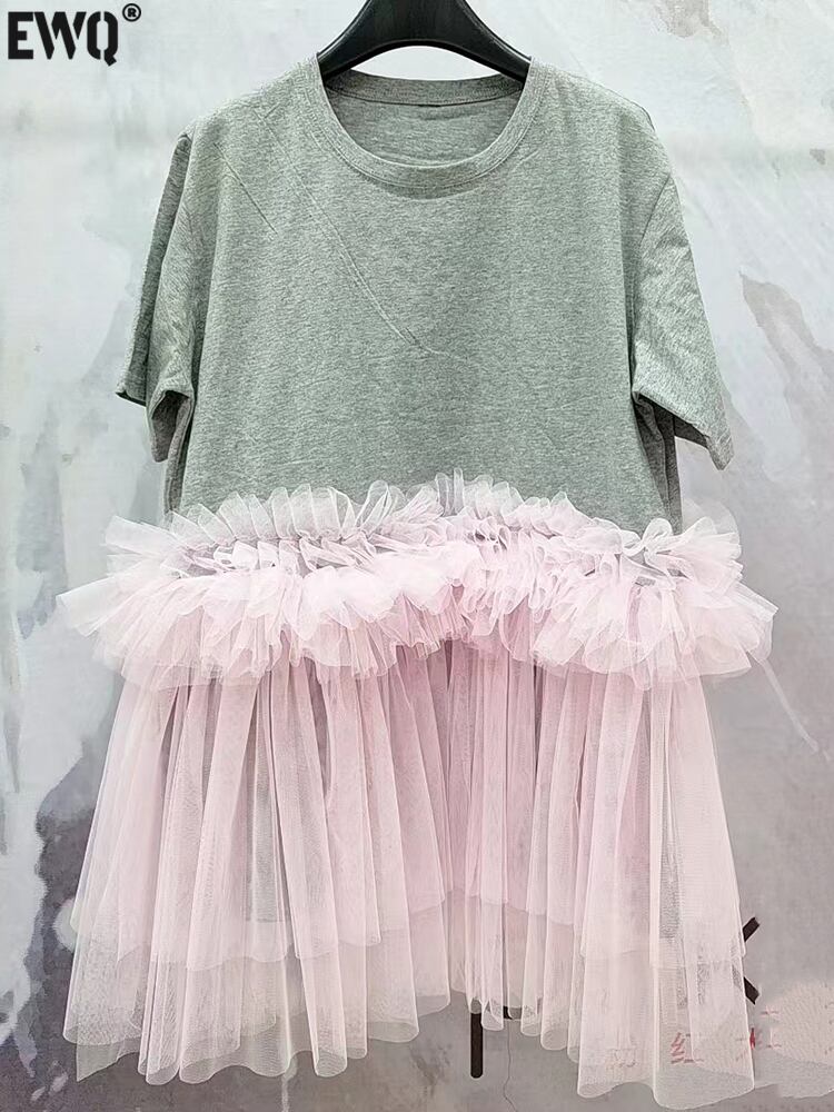 【EWQ】able Hem Mesh Spliced Long T-Shirt Loose Causal O-neck Gray Patchwork Tees Top Summer Tide T-Shirt 16Y9127 ロング サマー 夏物 メッシュ Oネック Tシャツ