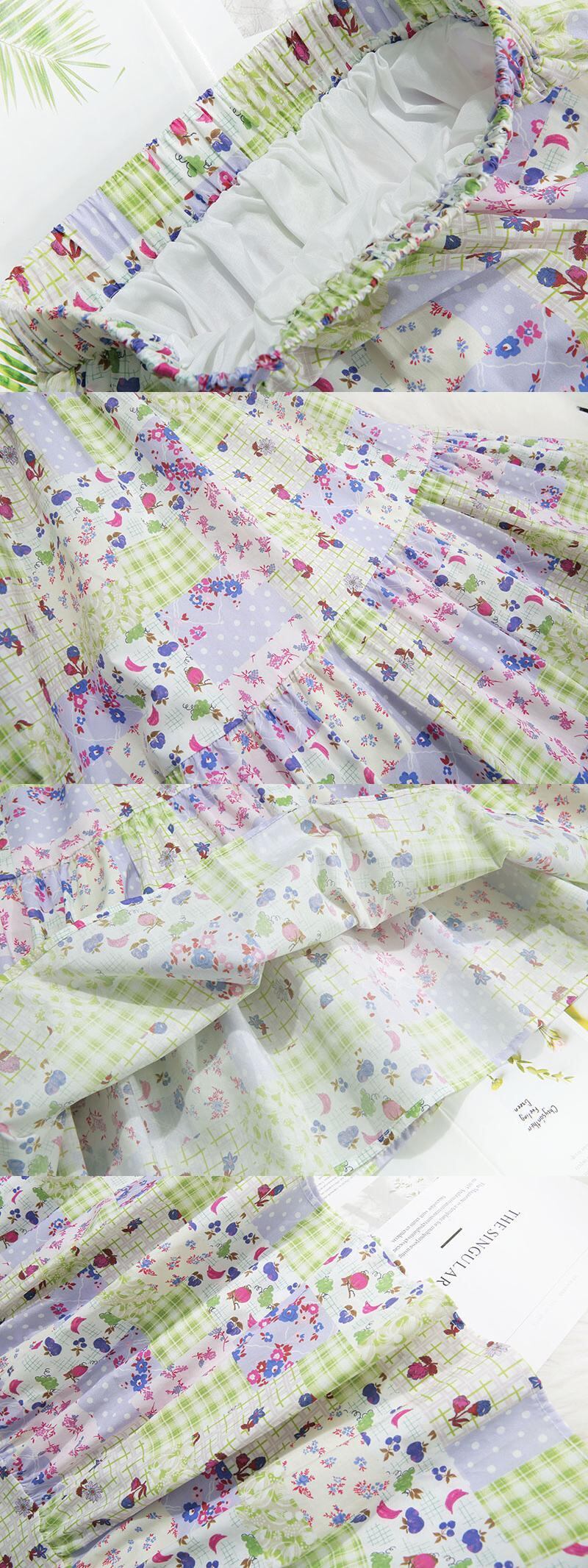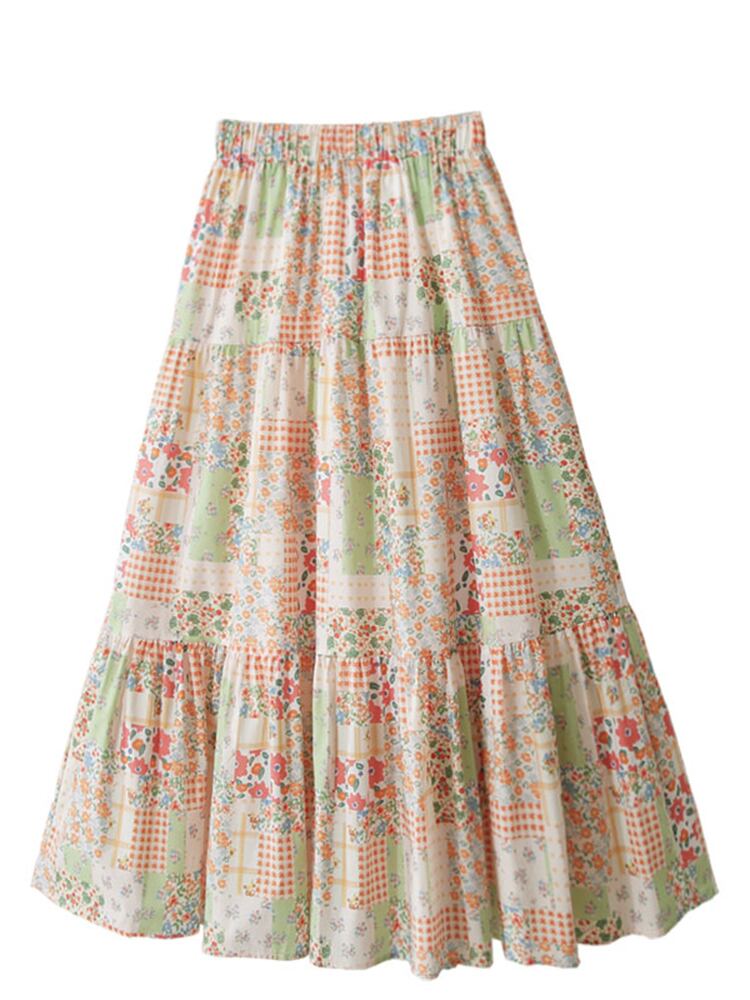 [EWQ] プリント花弾性ウエストスカート春夏潮コントラストカラーミッドカーフスカートオールマッチ服 エラスティック 伸縮 スプリング 春物 サマー 夏物 フラワーデザイン