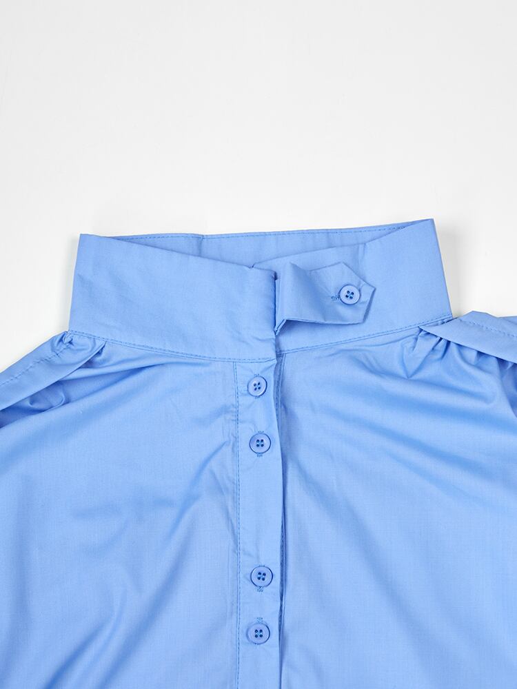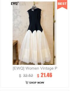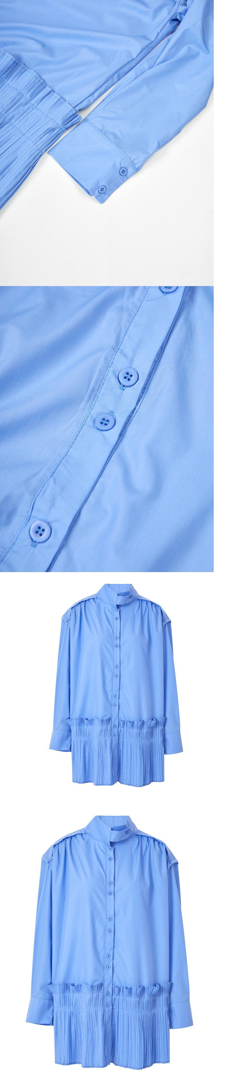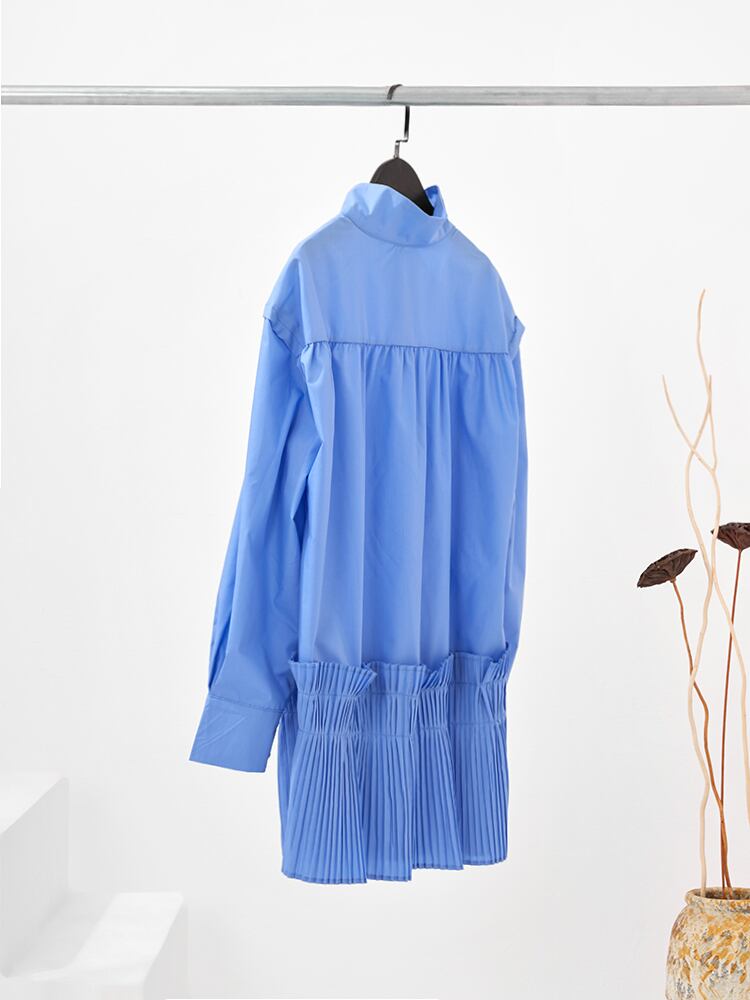 [EWQ] スタンドネックシャツドレス春潮スプライシングプリーツ A ラインドレスシングルブレストブルー Vestido 5652 スプリング 春物 Aライン