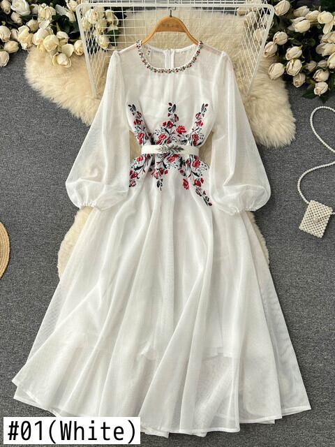 [EWQ] 刺繍花ガーゼ ビーズ ドレス パフ スリーブ コントラスト カラー メッシュ ドレス夏潮 Vestido 33 レッド サマー 夏物 フラワーデザイン