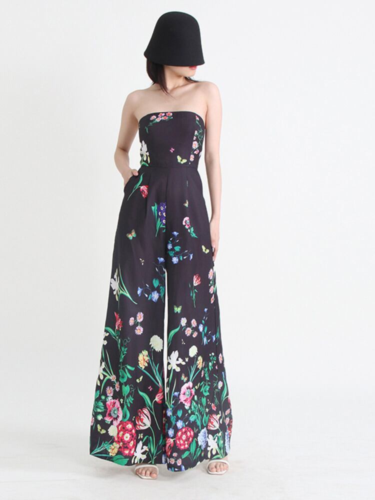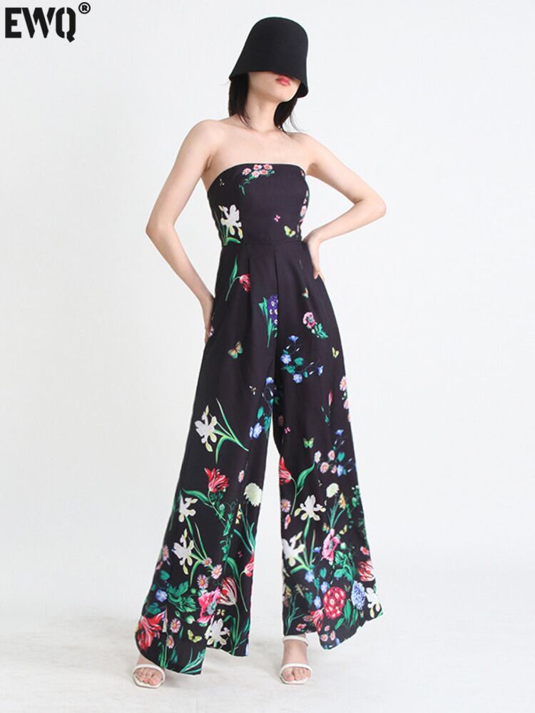[EWQ] オフショルダープリントコントラストジャンプスーツウエストワイドレッグパンツ春夏ラップスリムボディスーツ 16Y8238 スプリング 春物 サマー 夏物 ワイドパンツ