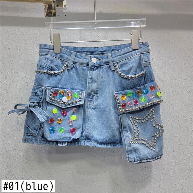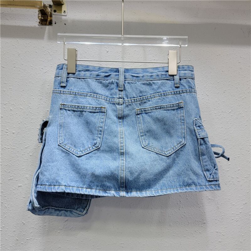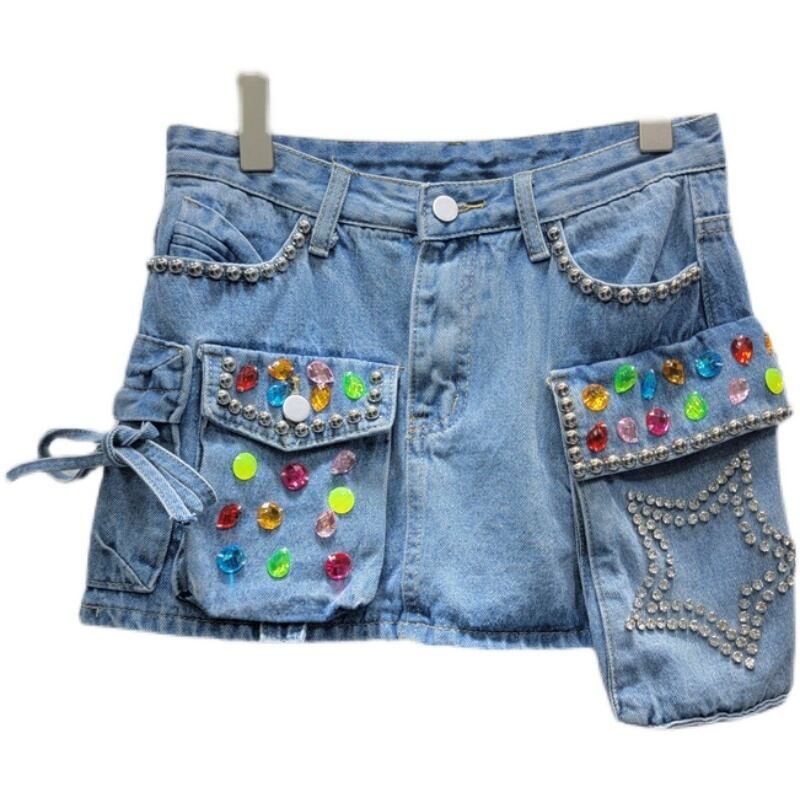 [EWQ] カラフルダイヤモンドデニムスカートレディースポケット不規則パッチワークレースアップショートAラインスカート夏潮 サマー 夏物
